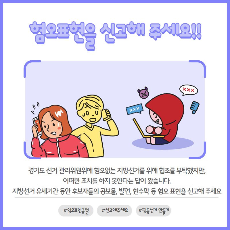 5월 19일 지방선거 유세가 본격적으로 시작되었습니다. 후보자들의 현수막과 방송 차들이 거리를 채우고 있습니다. 평등한 지방선거를 만들기 위해 <혐오표현 신고센터>를 운영합니다. 후보자들의 혐오 표현 발언, 현수막과 공보물 등의 차별과 혐오 표현을 보신다면 제보 부탁드립니다. 많은 관심과 참여 그리고 홍보 부탁드립니다. 혐오표현 신고는 아래에 링크를 통해 해주시길 바랍니다.
