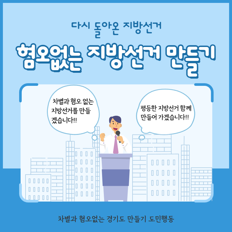 하지만 일부 정당과 후보자가 다수의 지지를 얻기 위해 차별적인 정책, 공약을 수립하거나 노골적으로 혐오 표현을 하는 경우가 발생합니다. 차별과 혐오로 가득찬 선거를 대선을 통해 경험했습니다. 표를 얻기 위해 차별과 혐오에 무분별한 사용은 민주주의 장이 아닌 차별과 혐오로 얼룩진 선거를 만들었습니다. 어떠한 변화도 없이 차별과 혐오 표현을 사용하는 제8회 동시지방선거가 된다면 결국 차별과 혐오로 얼룩진 선거가 반복 될 것입니다.