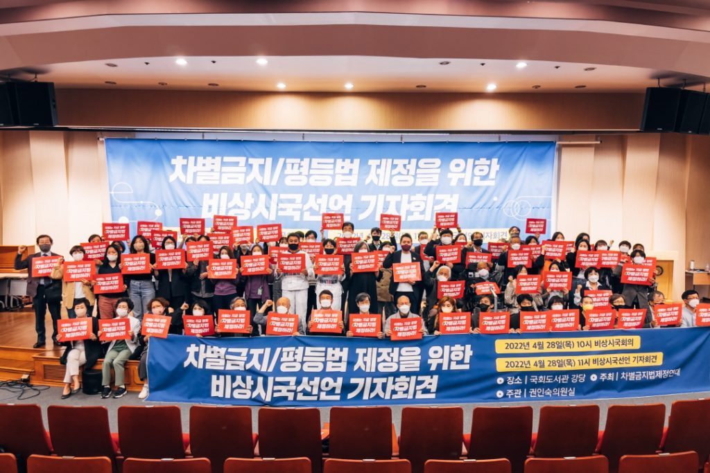 새 정부가 들어서는 2022년 봄, 지금 우리는 차별금지법 제정의 필요성을 더욱 절감한다. 이미 오래 전부터 확산되어온 차별과 혐오 선동의 정치, 이를 방관하는 정치가 인간의 존엄과 한 사회의 민주주의를 어떻게 무너뜨릴 수 있는지를 매 순간 목격하고 있기 때문이다. 특정 소수자를 향한 비방은 점차 확산되어 사회전반에 혐오의 정서를 퍼뜨렸고, 이제 여성과 장애인, 성소수자, 비정규직 노동자, 이주민, 지방대생과 청소년 등 가릴 것 없이 혐오의 표적이 되고 있다. 무엇보다 정치가 차별과 혐오를 조장하고 강화하는 데 앞장서고 있다. 헌법에 명시된 성평등 가치에도 불구하고 ‘여성가족부 폐지’가 대선 공약으로 등장하고, 장애인의 권리투쟁이 비장애인 시민의 권리를 빼앗는 것으로 선동되며, 최소한의 노동권을 보장하기 위한 조치들의 후퇴가 기업경영의 자율과 효율이라는 미명하에 정당화되고 있다.