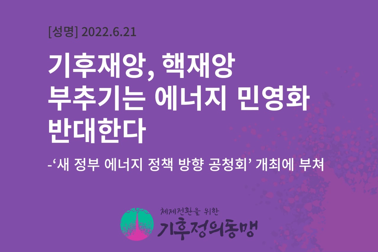 산업통상자원부(이하 산자부)는 오늘(21일) ‘새정부 에너지정책 방향 공청회’를 개최한다. 배포된 산자부의 발표자료는 윤석열 대통령이 대선에서 발표한 공약과 인수위원회가 발표했던 국정과제에서 제시한 에너지정책과 크게 다르지 않았다. 다른 점이 있다면 러시아의 우크라이나 침공으로 인해서 가속화된 세계 에너지 가격 폭등이라는 배경이 더해졌지만, 이를 핵발전 확대와 착취적인 에너지/자원의 해외 채굴 명분으로만 이용하고 있다. 기후정의동맹은 윤석열 정부의 에너지정책은 기후재앙을 막을 의지가 없으며 핵재앙과 에너지 민영화만 부추기게 될 것이라고 판단한다. 윤석열 정부에게 현재의 에너지정책 방향 추진을 멈추고, 기후재앙과 핵재앙을 막고 에너지 공공성을 바로 세울 수 있는 방향으로 정의로운 에너지 전환을 추진할 것을 강력히 촉구한다.