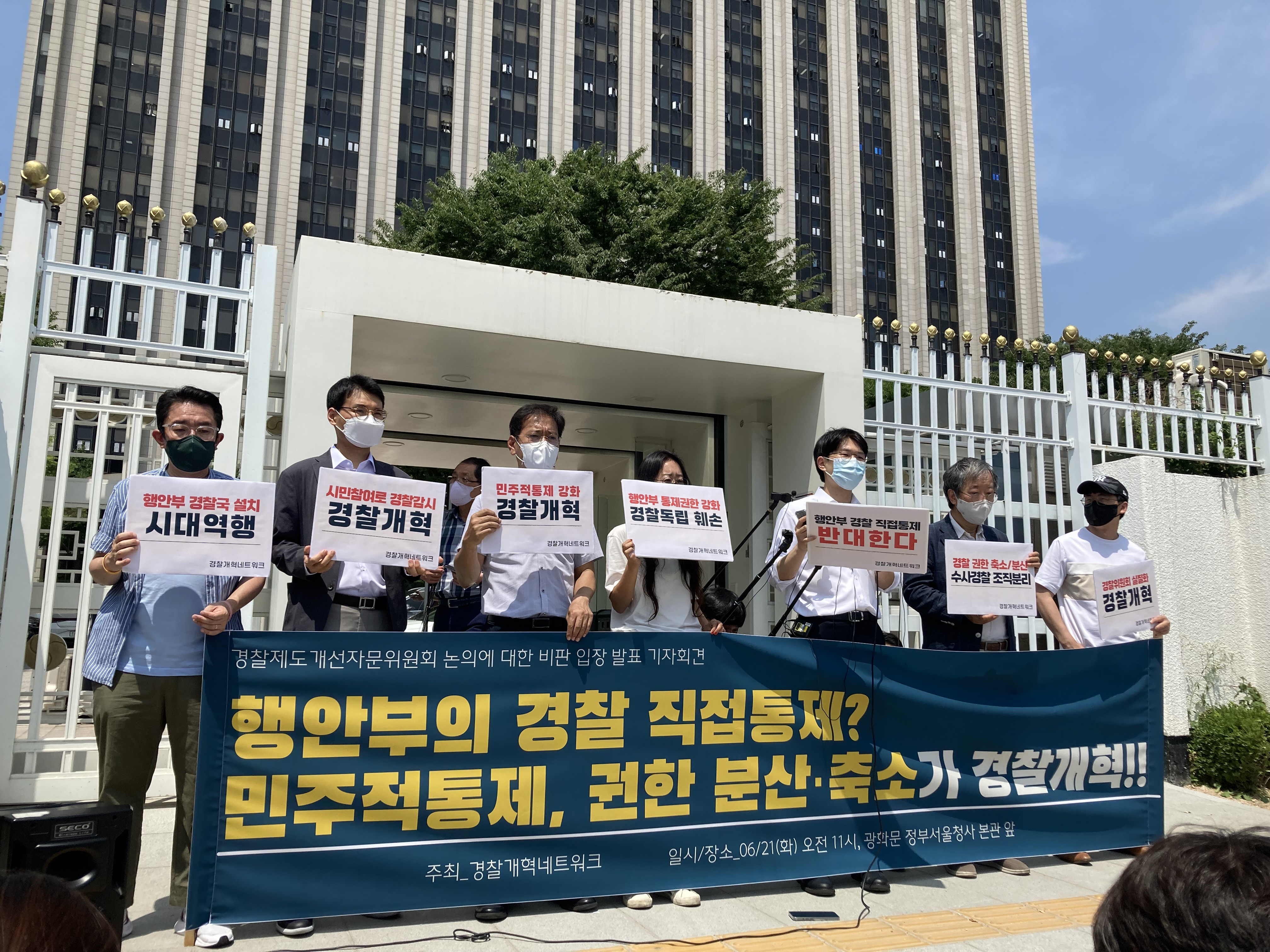 수사와 정보 뿐만 아니라, 교통, 생활안전과 방범, 집회시위 등 경찰은 시민의 생활과 밀접하게 연결되어 있다. 물리력과 강제력을 동원하는 업무의 특성으로 인해 경찰권한의 남용, 정치권력에 동원되는 경찰력은 기본권 침해로 그치지 않고 시민의 안전과 생명을 위협할 수 있다. 정치권력이 경찰을 정권의 안위를 위해 동원하지 못하게 하고, 경찰에게 과도하게 집중된 권한을 축소⋅분산하고 민주적통제를 강화하는 경찰개혁은 여전히 절실하다. 오늘 우리가 기자회견에 나선 이유는 분명하다. 경찰개혁과 관련된 사안을 행안부의 비공개 자문위원회가 좌우해서는 안된다. 비대해진 경찰에 대한 통제방안에 대한 논의는 필요하다. 그러나 엉터리 절차와 과정을 통해서 결정될 사안이 아니다. 어떻게 비대해진 경찰의 권한을 분산시키고, 민주적으로 통제할 것인지 공론화 과정부터 시작해야 한다. 민주적 통제 강화를 국회입법이 필요하다는 이유로 미뤄서는 안된다. 당연하게도 국회에서의 논의과정을 거쳐 입법을 통해 경찰에 대한 개혁방안이 만들어지고 시행되어야 한다.