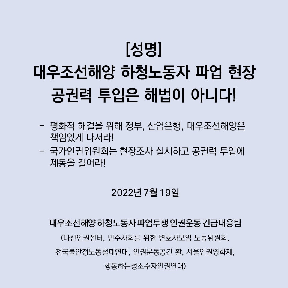 | [성명] 대우조선해양 하청노동자 파업, 공권력 투입이 아니라 실질적 교섭이 해답이다 (0) | 2022.07.20 |