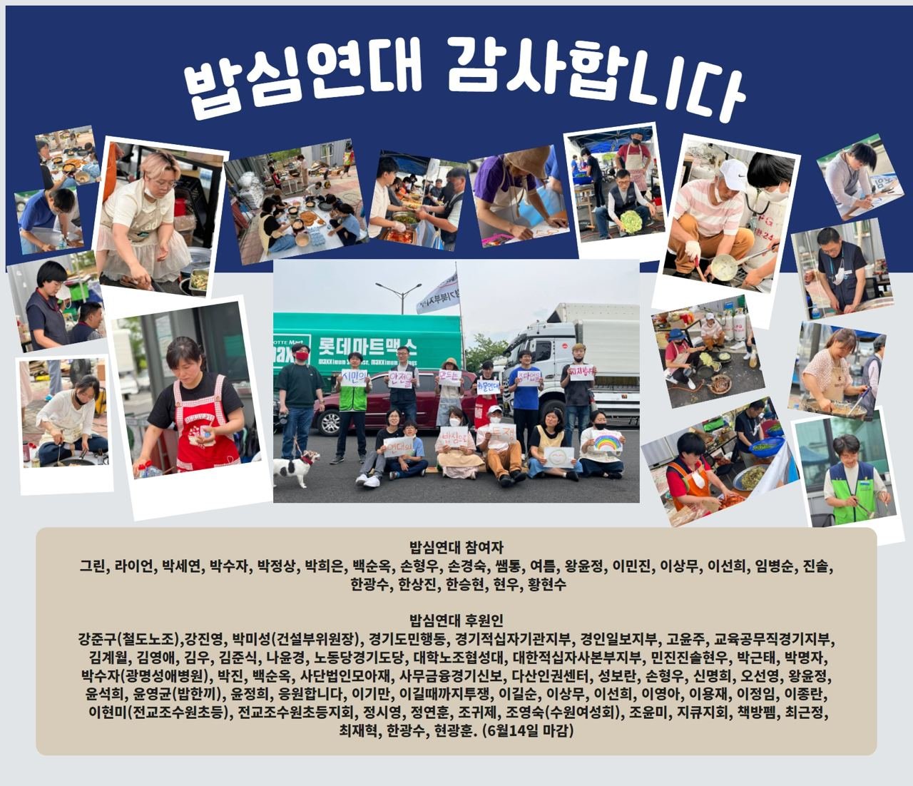 6월7일 화물연대는 안전운임제 일몰폐지와 전품목 전차종 확대를 위한 총파업을 8일간 진행했습니다. ‘화물연대 총파업을 응원하는 경기·수원지역 시민들’은 화물연대 노동자들을 위해 ‘밥심연대’를 조직하고 6월12일 노동자들의 저녁 한 끼를 마련하여 함께 했습니다. ‘밥심연대’ 준비기간이 짧았으나 시민의 안전을 만드는 화물자동차 안전운임제의 중요성을 인지하고 제도가 지속·확대 추진되길 바라는 많은 분들께서 참여와 후원을 보내 주셨습니다. 덕분에 화물연대 노동자들에게 힘이 되어 드릴 수 있어서 매우 의미있는 행사가 되었습니다. 이후 14일에 화물연대와 국토부가 합의를 이뤘고, 화물연대 서경지부에서는 ‘밥심연대’의 든든한 응원으로 투쟁 승리할 수 있었다는 메시지도 전해 주셨습니다. 앞으로도 시민들의 참여를 바탕으로 재미난 기획과 행동을 만들어 나가겠습니다.