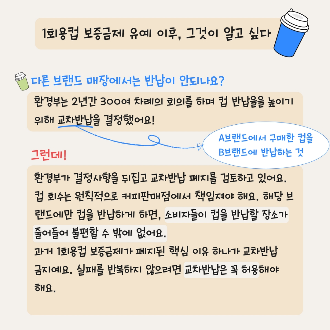 제도 시행을 유예하는 걸로 모자라 환경부가 교차반납 폐지(A브랜드에서 구매한 컵을 B브랜드에 반납하는 것)를 검토하고 있다는 점이 드러났습니다. 이렇게 되면 소비자들이 컵을 반납할 장소가 줄어들어 수거 및 회수가 어려워질 수 밖에 없습니다.
