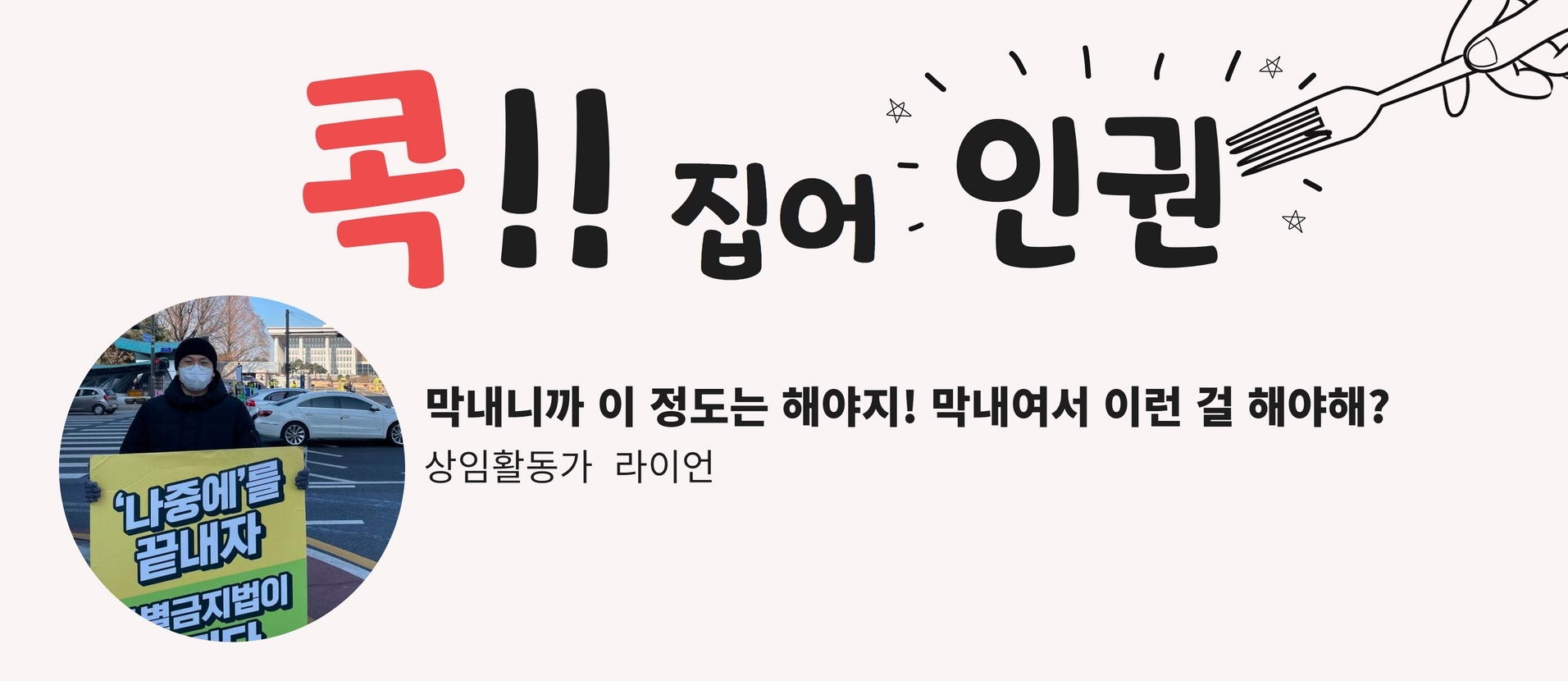 [웹 소식지 몸살 15호_2022년 가을] 콕 집어 인권 "막내니까 이 정도는 해야지! 막내여서 이런 걸 해야해?" (0) | 2022.10.05 |