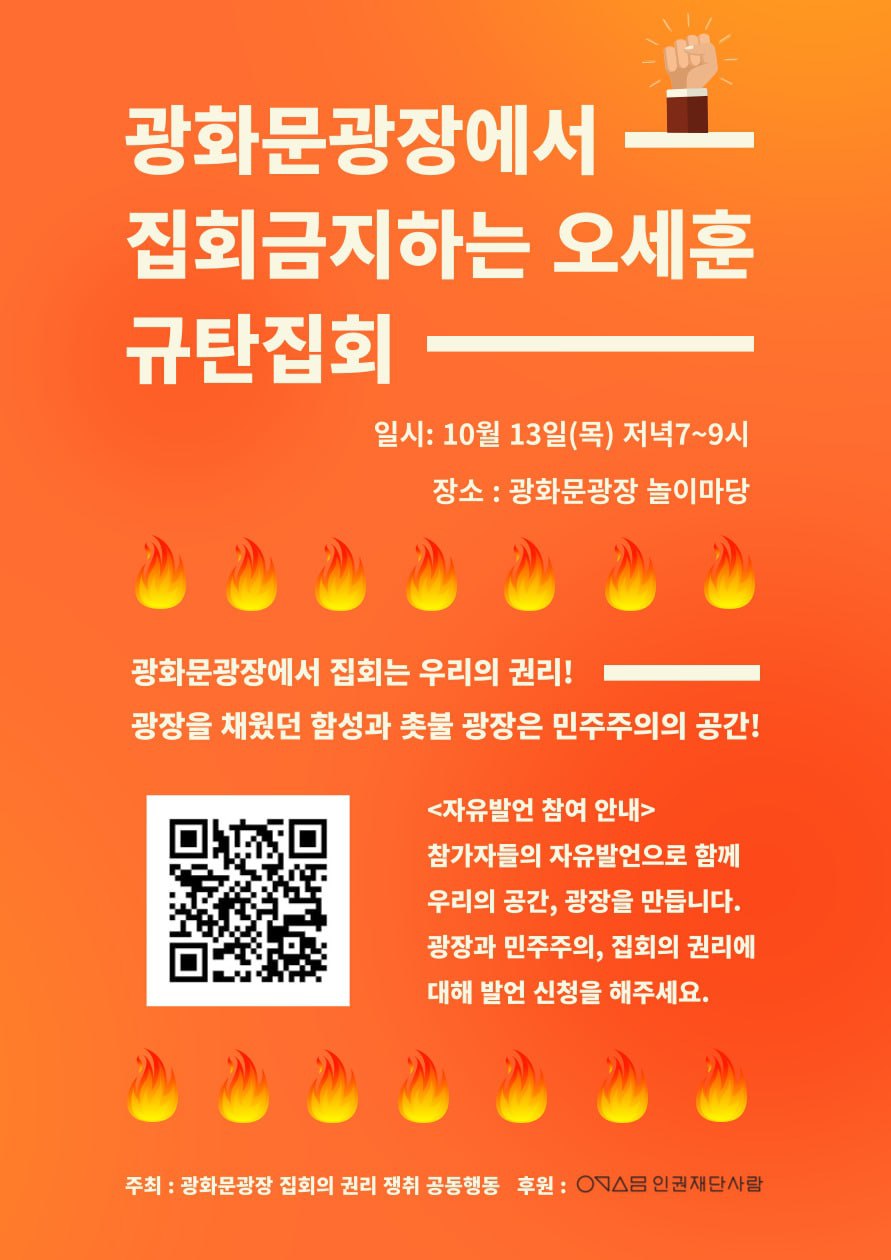광장은 여가와 문화의 공간이자 시민들의 공론장입니다. 특히 광화문광장은 2017년 촛불집회를 비롯해 수많은 집회가 개최된 역사적인 장소입니다. 그럼에도 헌법을 무시하고 조례를 통해 집회를 불허하는 오세훈 서울시장의 행태를 규탄하고자 <광화문광장 집회의 권리 쟁취 공동행동>은 10월 13일 집회를 개최합니다.