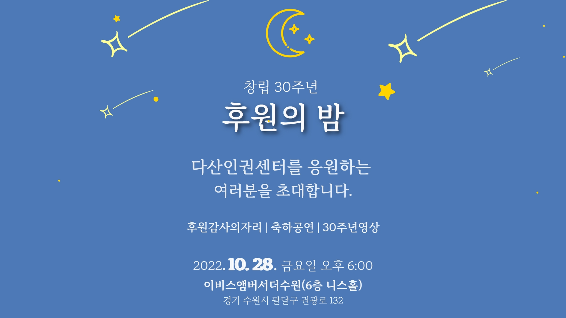 | ○ 창립 30주년 ‘후원의 밤’에 초대합니다. - 일시 : 2022. 10. 28.(금) 오후6시 - 장소 : 이비스 앰배서더 수원(6층 니스홀) ○ 후원계좌. 기업은행 111-199577-04-046 (다산인권센터) ○ 후원문의. 031-213-2105 / humandasan@gmail.com ○ 30주년 특별페이지 방문하기. https://bit.ly/다산30주년특별페이지 ○ 후원약정. https://bit.ly/다산30주년후원약정 |