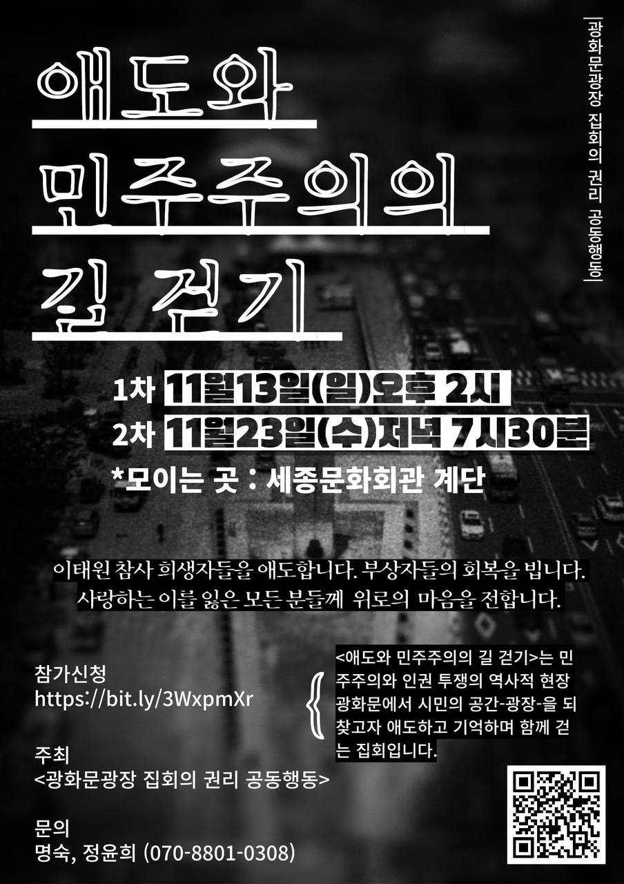 이에 시민사회•인권단체들이 모인 <광화문광장 집회의 권리 공동행동>은 광화문에서 민주주의와 인권을 쌓아가던 역사의 현장, 집회현장을 돌며 ‘애도와 민주주의의 걷기’을 하며 광장을 되찾고자 합니다.