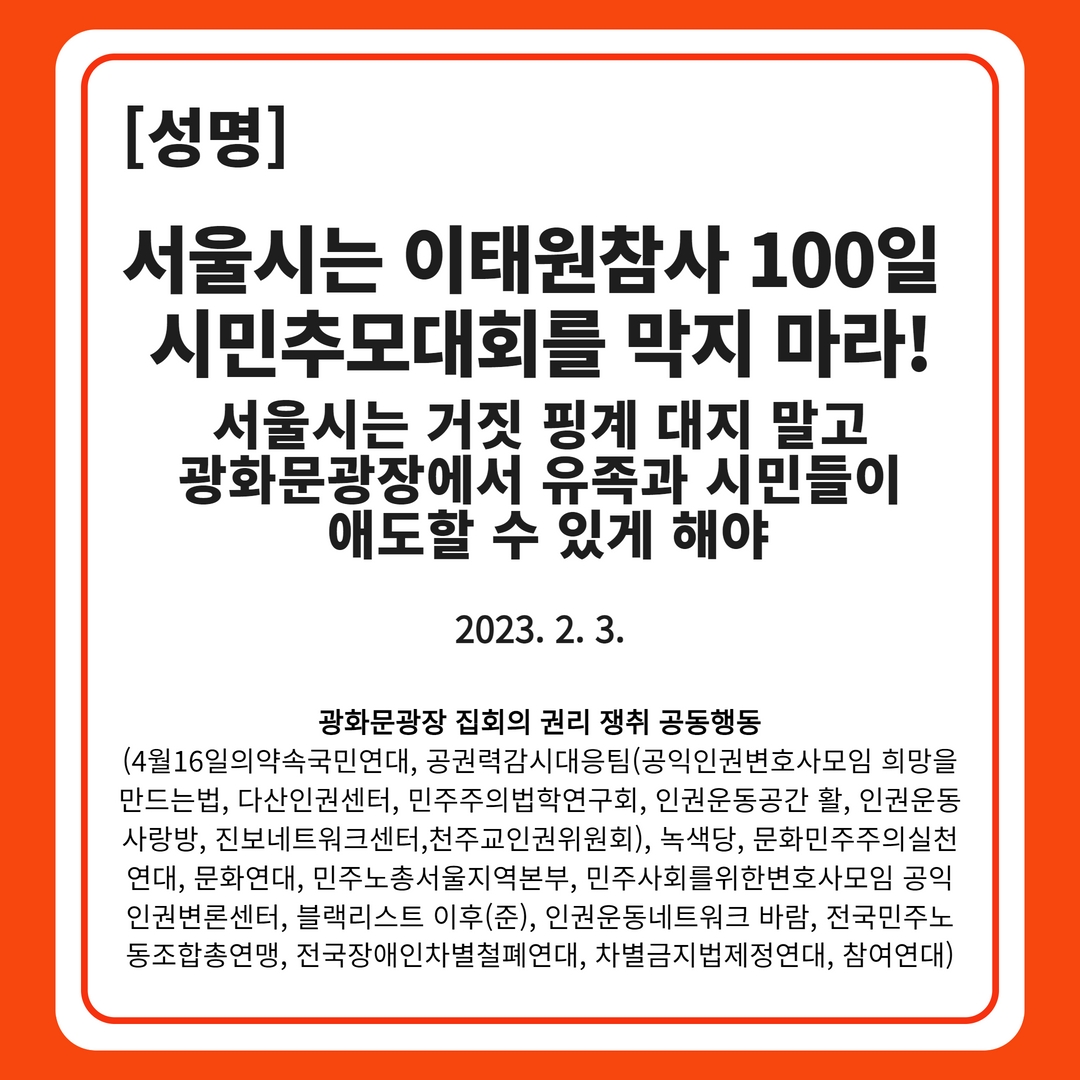 <광화문광장 집회의 권리 쟁취 공동행동>은 다시 한 번 서울시에 촉구한다. 광장은 모든 사람에게 열려 있어야 한다. 광장은 민주주의가 싹트는 장소여야 한다. 민주주의는 고통 받는 이들과 손잡고 연대하는 속에서 시민들이 만들어 가는 것이다. 더 이상 서울시는 민주주의와 애도의 행동을 가로막아선 안 된다. 이제라도 서울시는 100일 추모대회 행사 장소사용 신청을 수리해야 한다. 나아가 10. 29이태원참사에 대한 서울시의 책임을 오롯이 인정하고 사죄해야 한다. 서울시에 경고한다. 서울시가 끝까지 100일 추모대회 행사를 위한 광화문광장 사용을 가로막는다면 전국민적인 저항에 부딪힐 것이다. 우리는 시민들과 함께 이태원 참사 희생자들을 애도하고 진실규명을 위해 실천할 것이다.