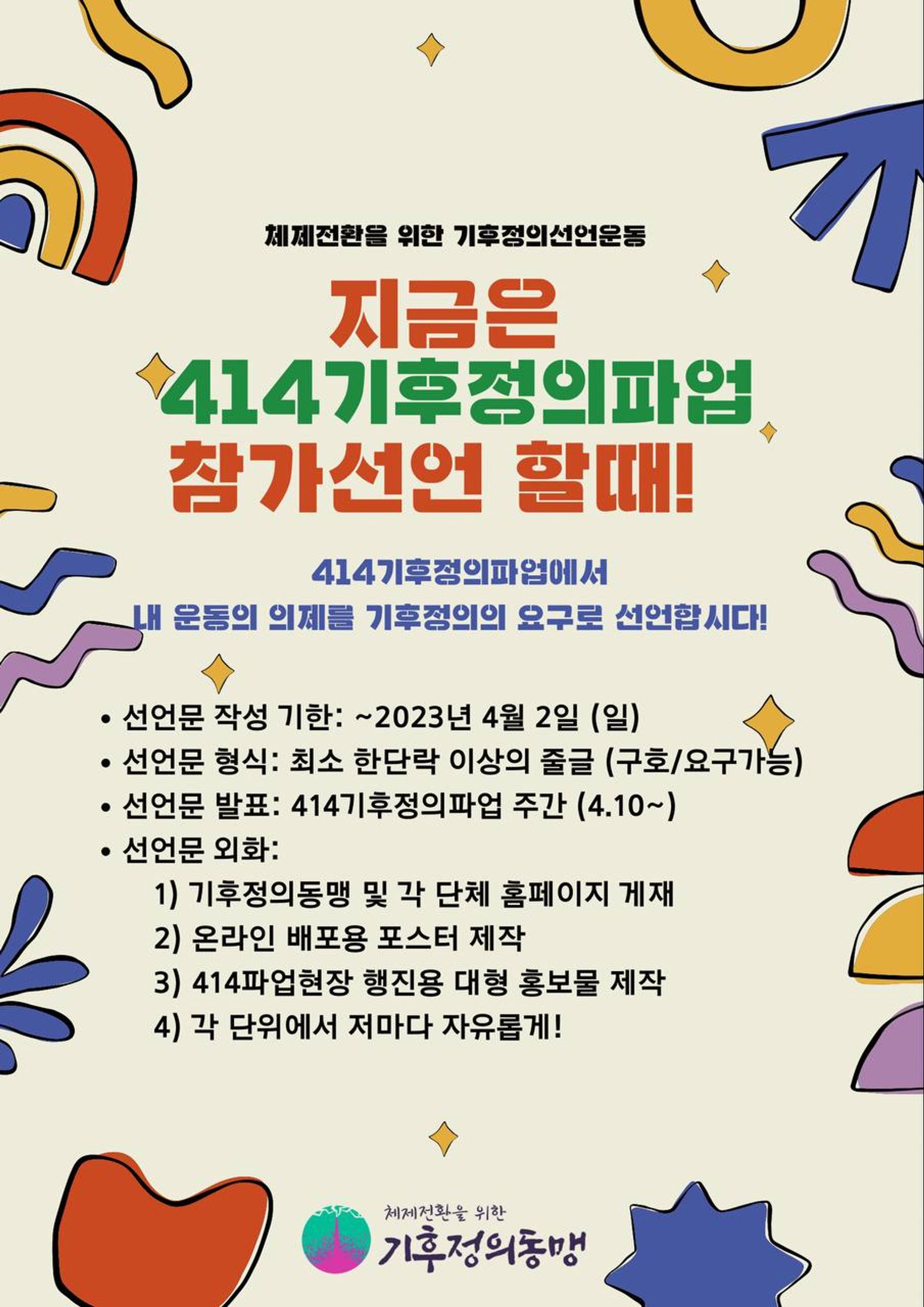 완결적인 선언문이 아니어도 좋습니다. 414기후정의파업을 시작으로 나의 운동의 의제를 기후정의의 요구로 만드는 기후정의선언운동을 시작해보아요~!