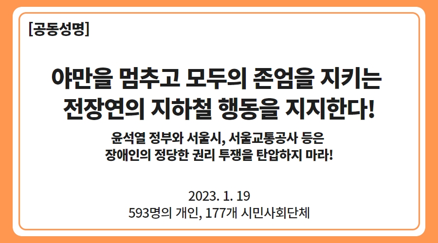 하나, 우리는 한국 사회의 야만을 멈추기 위해 모두의 존엄을 지키는 전장연의 지하철행동을 지지한다!
