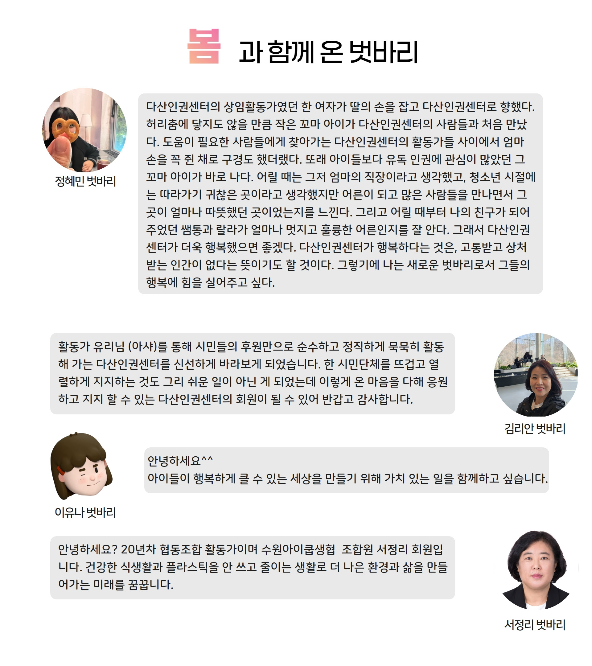 〇 봄과 함께 온 벗바리 : 정혜민 벗바리, 김리안 벗바리, 이유나 벗바리, 서정리 벗바리