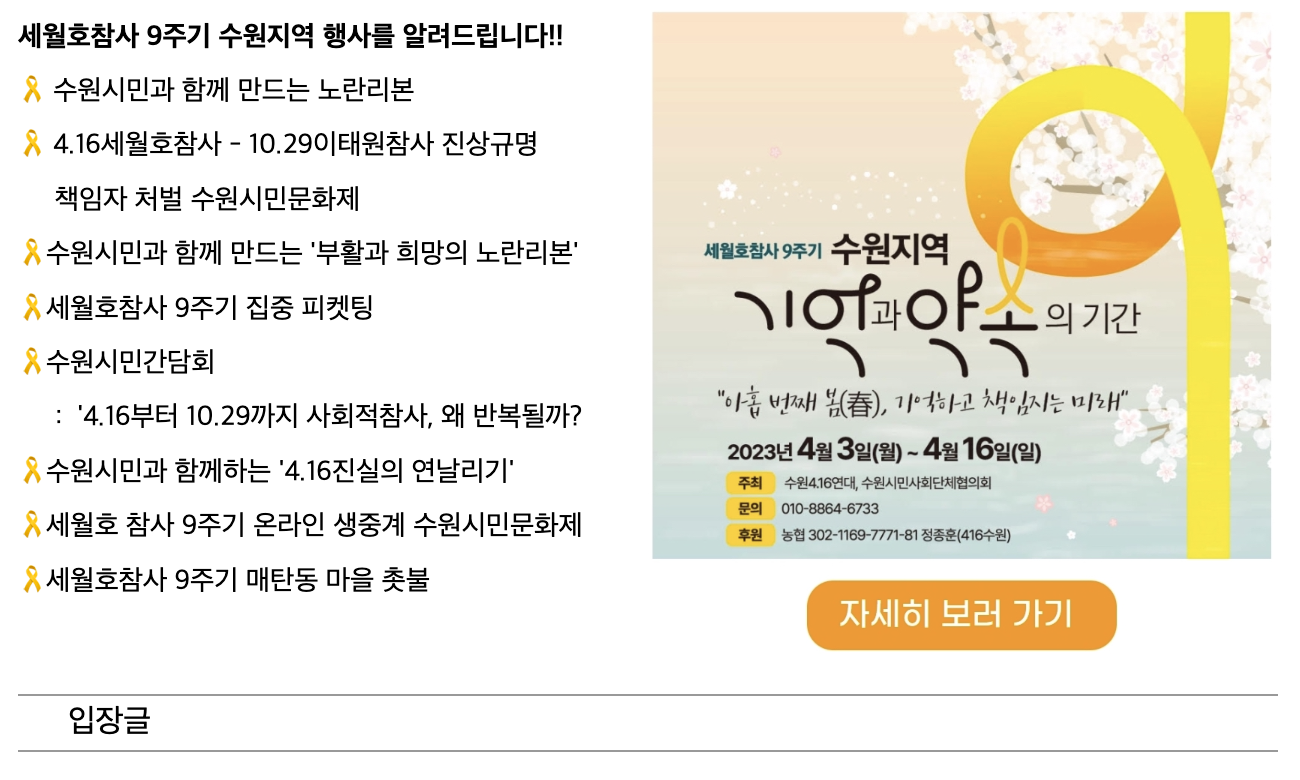 - 세월호참사 9주기 수원지역 행사를 알려드립니다!!