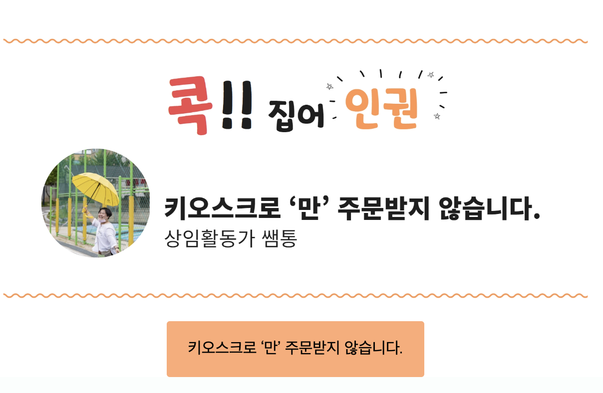 | [웹 소식지 몸살 17호_2023년 봄] 콕 집어 인권 "키오스크로 ‘만’ 주문받지 않습니다." (0) | 2023.04.05 |