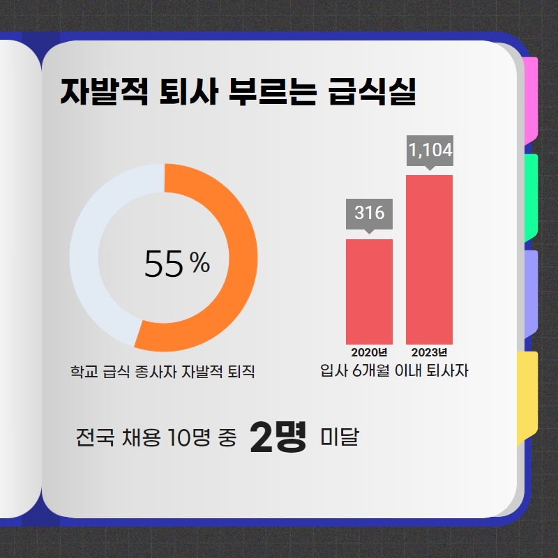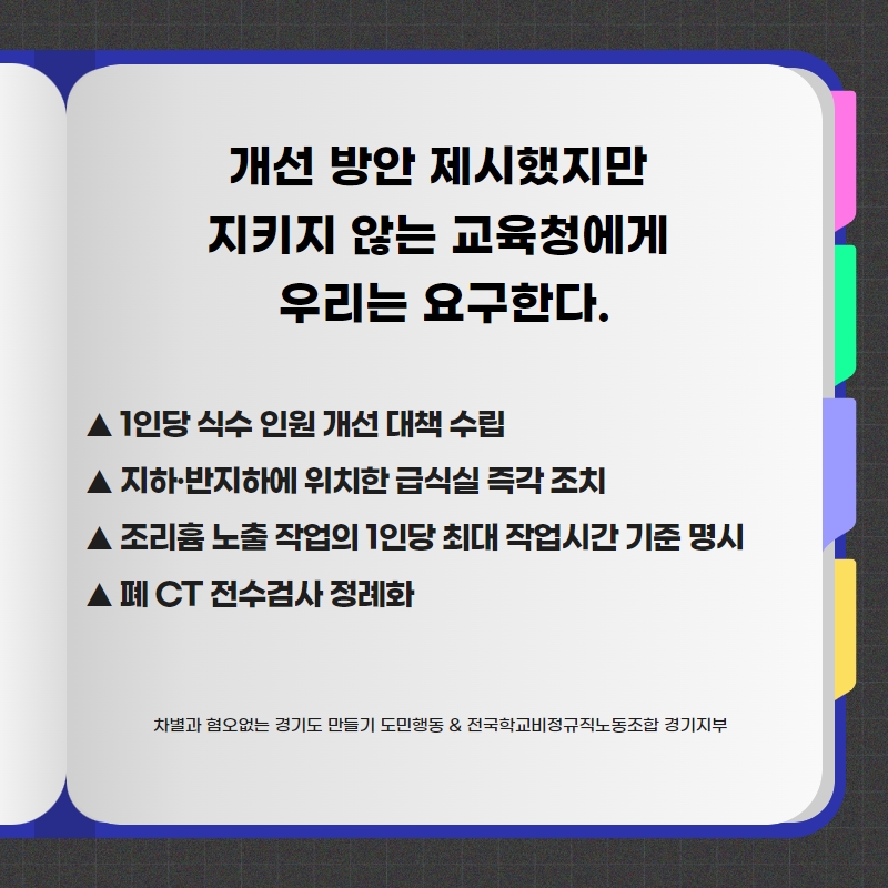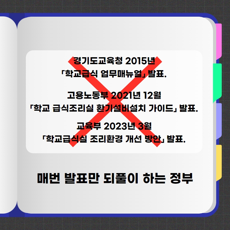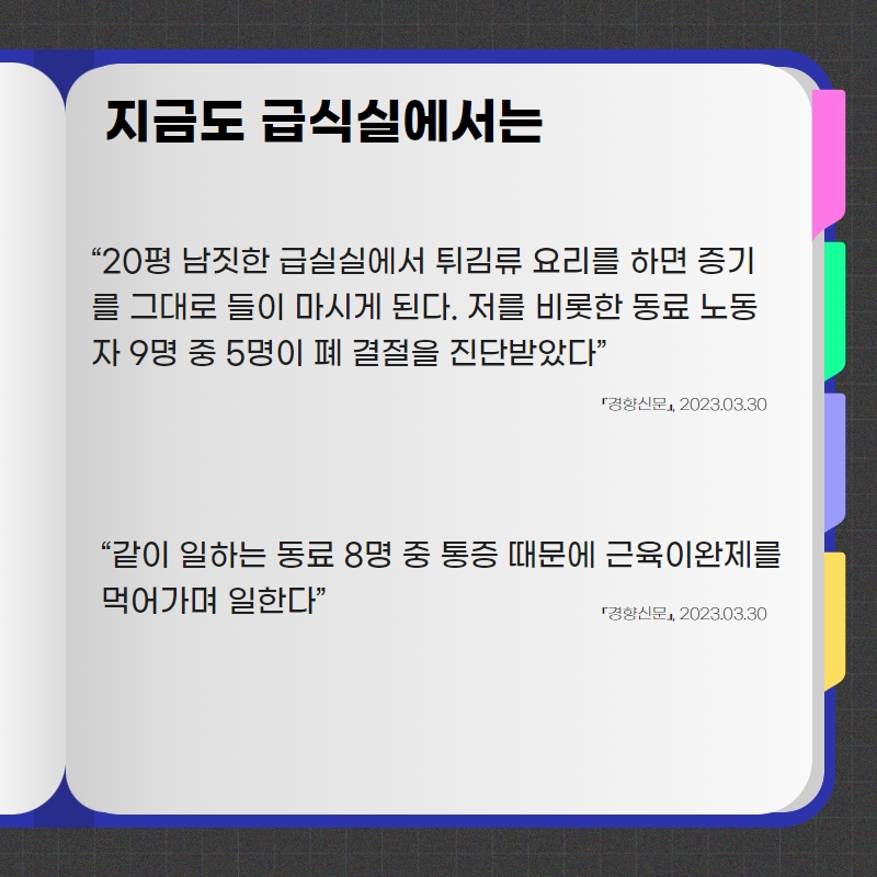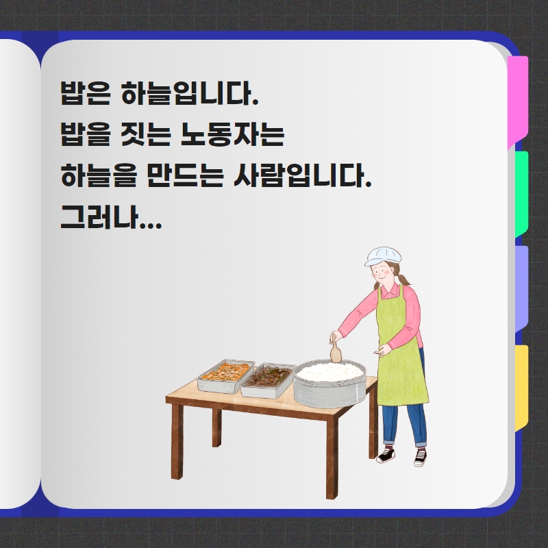 건강한 한끼 이면에는 건강하지 않는 노동환경과 고강도 노동으로 인해 고통 받는 학교 급식 노동자들이 있습니다.