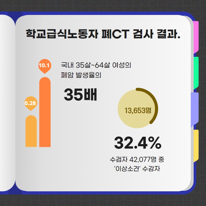35세~64세 여성의 암 발생율 보다 35배(2019년 보건복지부 통계) 높은 폐암발생률을 나타내고 있습니다.
