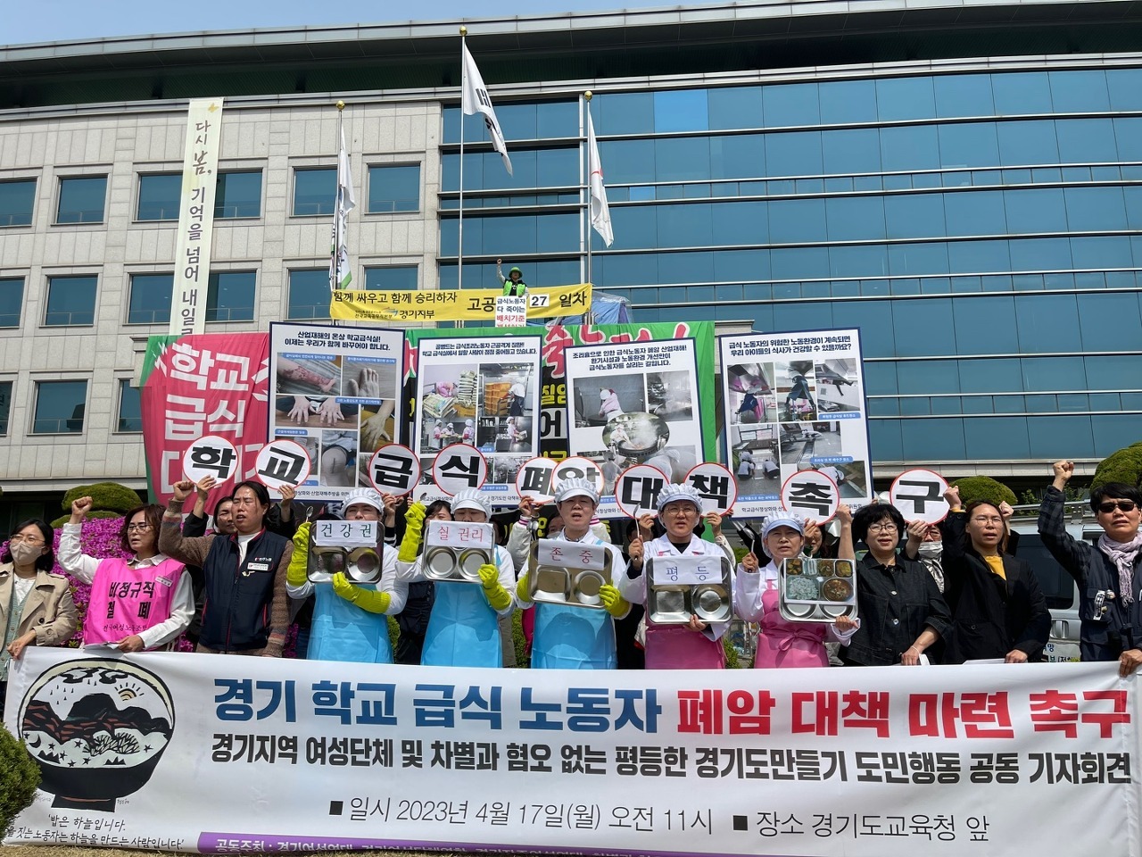 k급식에 대한 프로그램이 방영될 만큼 K급식의 관심과 인기가 높아지고 있습니다. 하지만 K급식에 대한 열광 이면에는 학생들의 건강한 한 끼를 짓기 위해 건강하지 않은 환경속에서 일하는 학교 급식 노동자들이 있습니다. 학교 급식 노동자는 1인당 평균 150명분의 식사를 준비하는 등 과중한 노동에 놓여있고, 35세~64세 여성의 평균 암 발생률 보다 35배 높은 폐암 발생률을 보이고 있습니다. 도민행동은 이러한 학교 급식 노동자들의 고강도 노동과 폐질환 대책 마련 촉구를 위한 기자회견을 4월17일 경기도교육청 앞에서 진행했습니다.