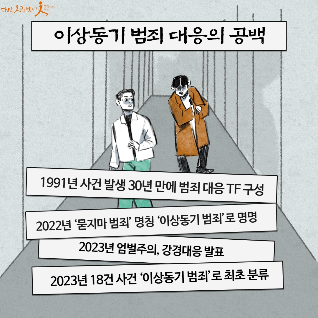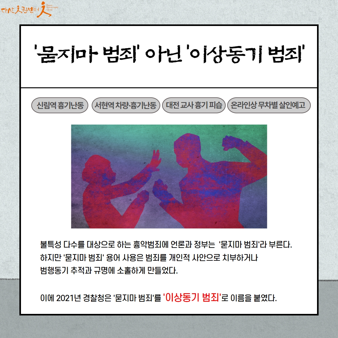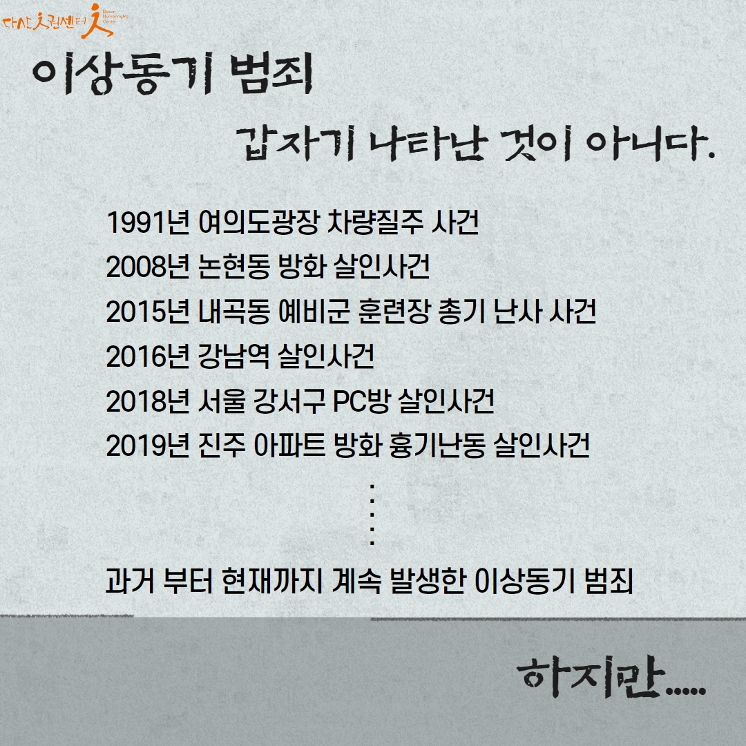 정부는 이러한 범죄들을 21년 '이상동기 범죄'라 이름을 붙였지만 여전히 '묻지마 범죄'라 부르며 범죄의 책임을 개인들에게 전가하고 엄벌로써 예방하겠다고 밝혔습니다.