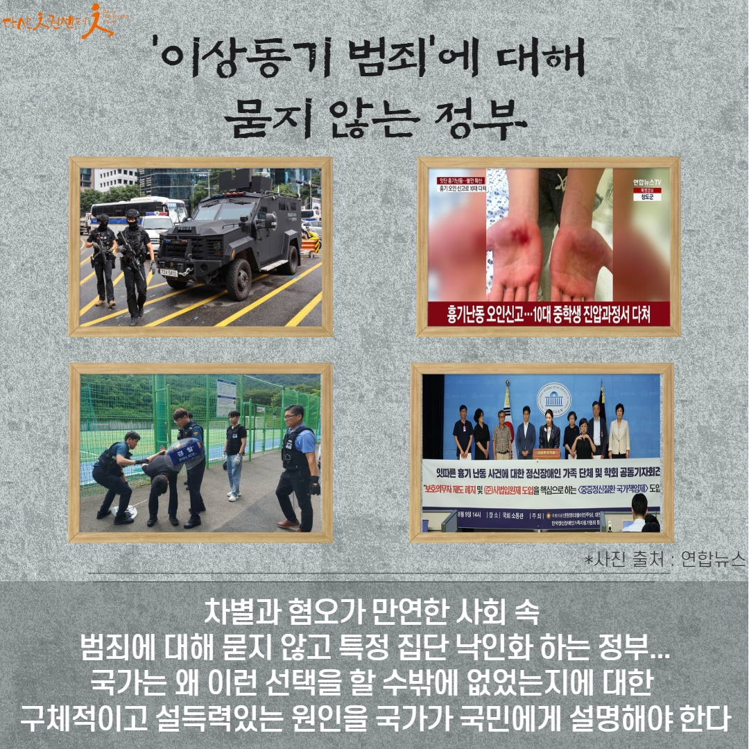 정부의 행동은 범죄를 특정집단에 잘못으로 낙인 찍으며 원인을 묻지 않고, 책임을 지려 하지 않고 있습니다.