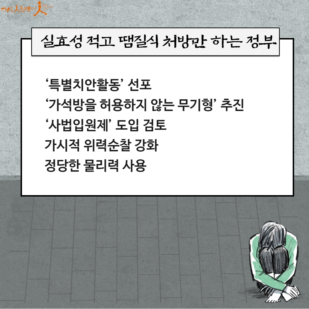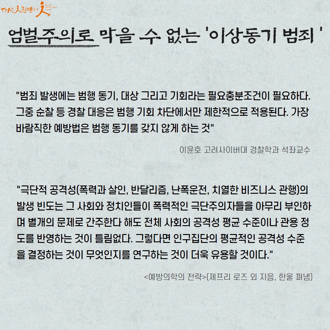 국가는 국민이 '안전'이 지켜질 수 있도록 해야합니다. '예방'이라는 명목하에 이루어지는 인권침해는 멈추고 차별과 혐오가 만연한 사회, 경쟁만능주의 사회에서 "왜" 범죄가 발생했는지에 대한 고민을 가져야 할 때입니다.