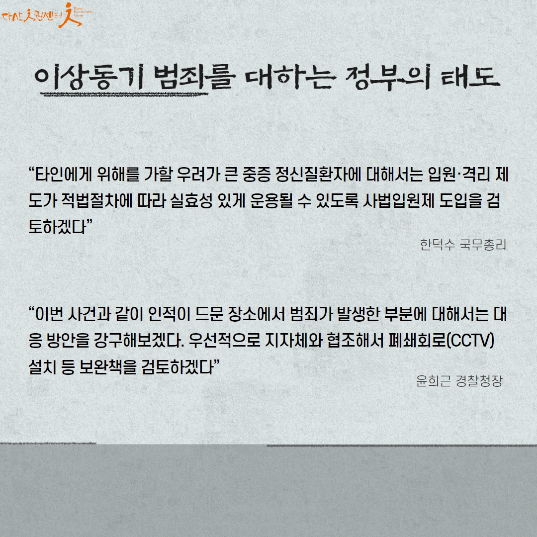 정부는 이러한 범죄들을 21년 '이상동기 범죄'라 이름을 붙였지만 여전히 '묻지마 범죄'라 부르며 범죄의 책임을 개인들에게 전가하고 엄벌로써 예방하겠다고 밝혔습니다.