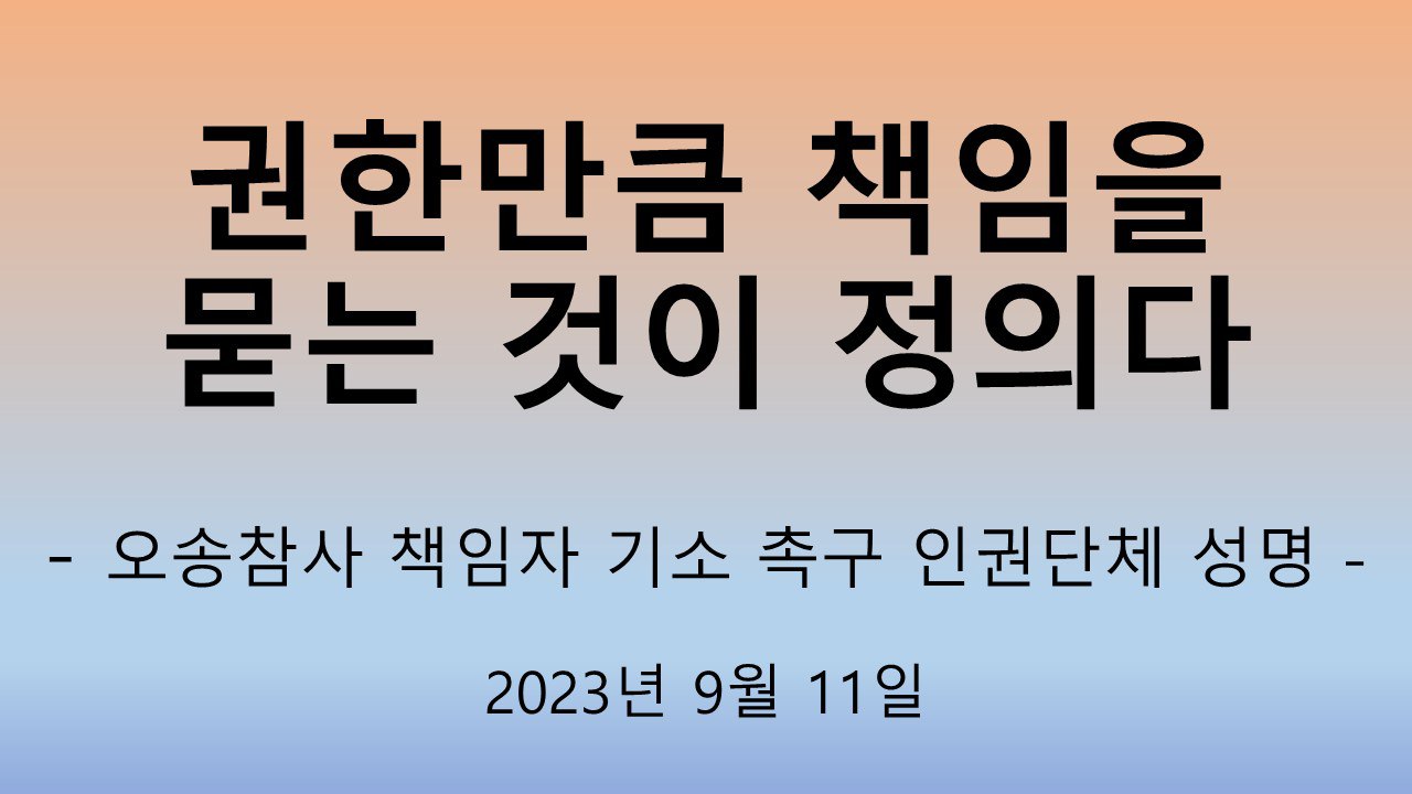 오송참사를 중대시민재해로 규정하며 진상규명과 책임자 처벌, 재발방지 대책을 요구하는 피해자들과 함께 우리 인권단체들도 진실과 정의를 세우는 걸음에 함께 합니다. 참사의 책임은 그토록 서로에게 미루던 이들 기관들이 참사의 기억을 지우는 분향소 철거에는 그토록 합심하는 모습에 분노하며 규탄합니다. 참사 이전에는 무방비로, 참사 당일에는 무관심으로, 참사 이후에는 무책임으로 일관하고 있는 이들 기관의 최고 책임자를 중대재해처벌법 위반으로 기소하여 조사에 나설 것을 촉구합니다. 이들 기관의 최고 책임자인 충북도지사, 청주시장, 행복청장이 부여받은 권한과 의무를 어떻게 수행하거나 하지 않았는지 제대로 묻는 것은 반복되는 재난참사 대응 실패를 전환하는 시작일 수 있습니다. 그 시작을 위한 걸음에 우리 인권단체들은 오송참사 피해자들과 함께 하겠습니다. 오송참사 희생자들의 명복을 빕니다.