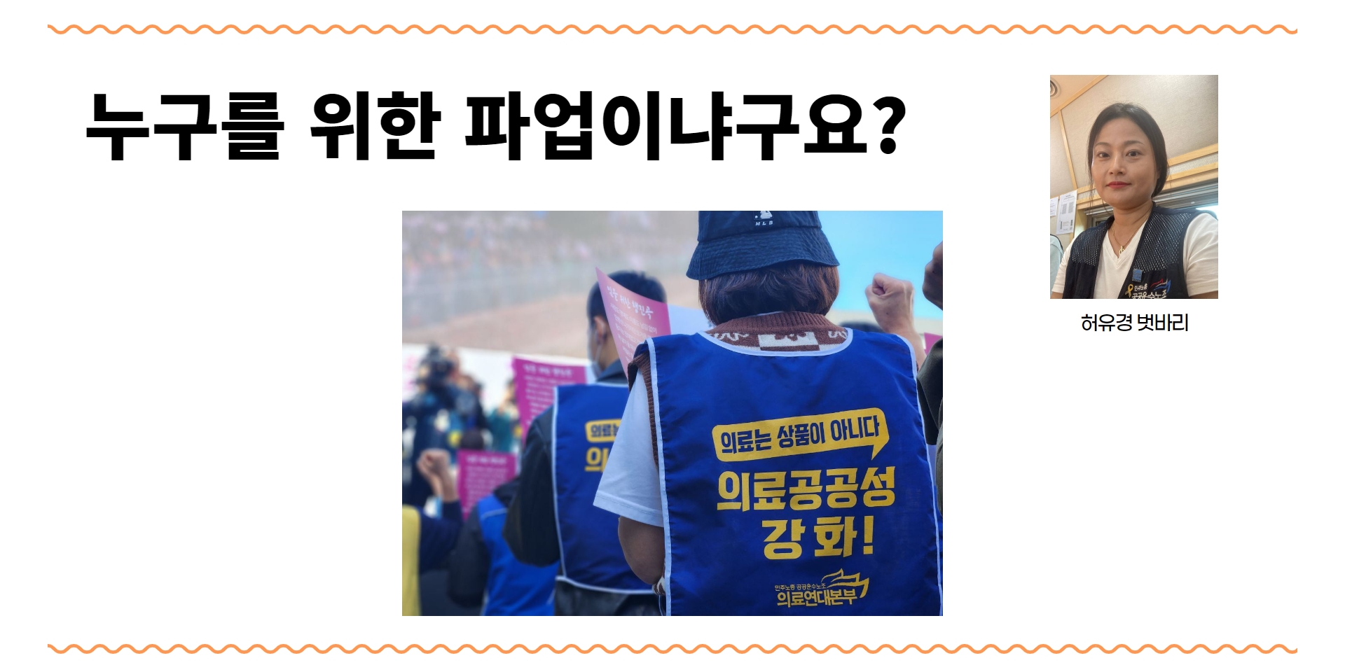 윤석열 정부는 누구를 위한 정부이고, 지하철-공공의료-건강보험 정책은 누구를 위한 정책인가? 정부가 살펴야 하는 건 재벌과 민간기업 만이 아니다. 대다수 국민이다. 안전한 사회를 만들고, 걱정없는 모두의 삶을 지키기 위해 공공운수노조가 파업을 하는 이유다.