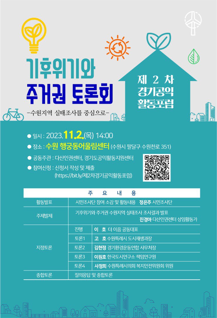 ‧ 내용 : 기후위기와 주거권 수원지역 실태조사 결과발표 및 전문가 토론