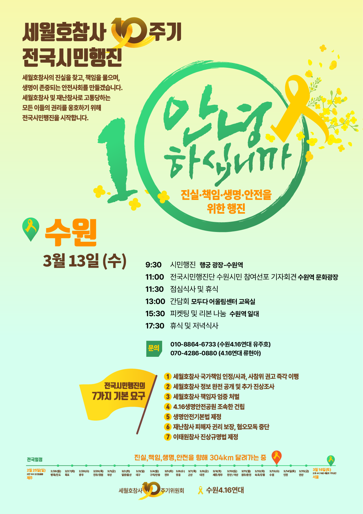 세월호참사 10주기 전국시민행진이 3월 13일 수원에 옵니다.