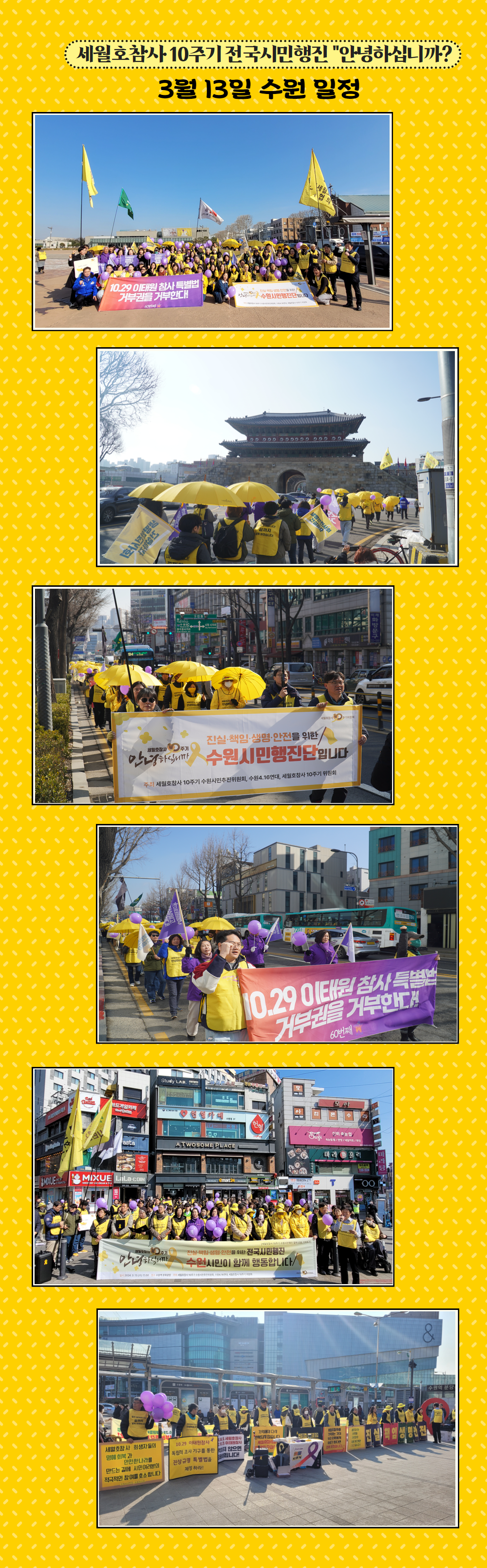 어제 (3/13) 세월호참사 10주기 전국시민행진 "안녕하십니까?" 수원 일정이 있었습니다. 세월호참사 유가족과 이태원참사 유가족 그리고 수원과 용인에서 오신 수많은 시민들이 행진에 함께 하였습니다.