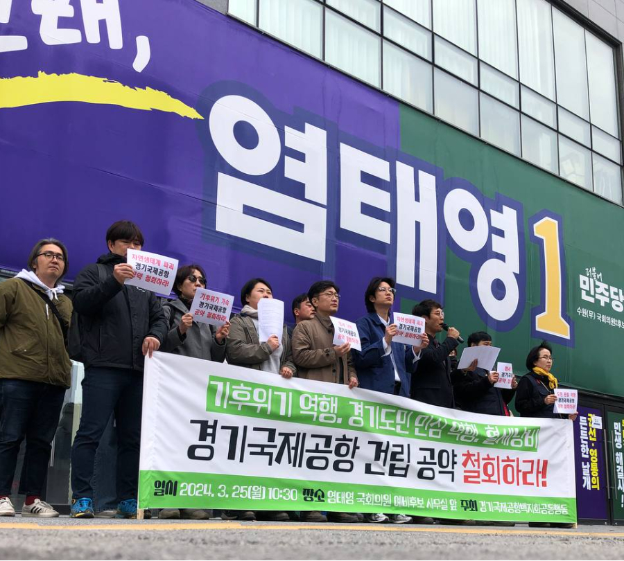 오늘(3/25) 오전 수원시무 국회의원 후보인 염태영 후보 선거사무실 앞에서 여러모로 시대착오적인 공약인 경기국제공항 건립 공약을 철회하라는 기자회견을 진행했습니다.