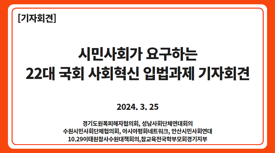 경기도원폭피해자협의회, 성남사회단체연대회의, 수원시민사회단체협의회, 아시아평화네트워크. 안산시민사회연대회의, 이태원참사수원대책회의, 참교육을위한전국학부모회경기지부