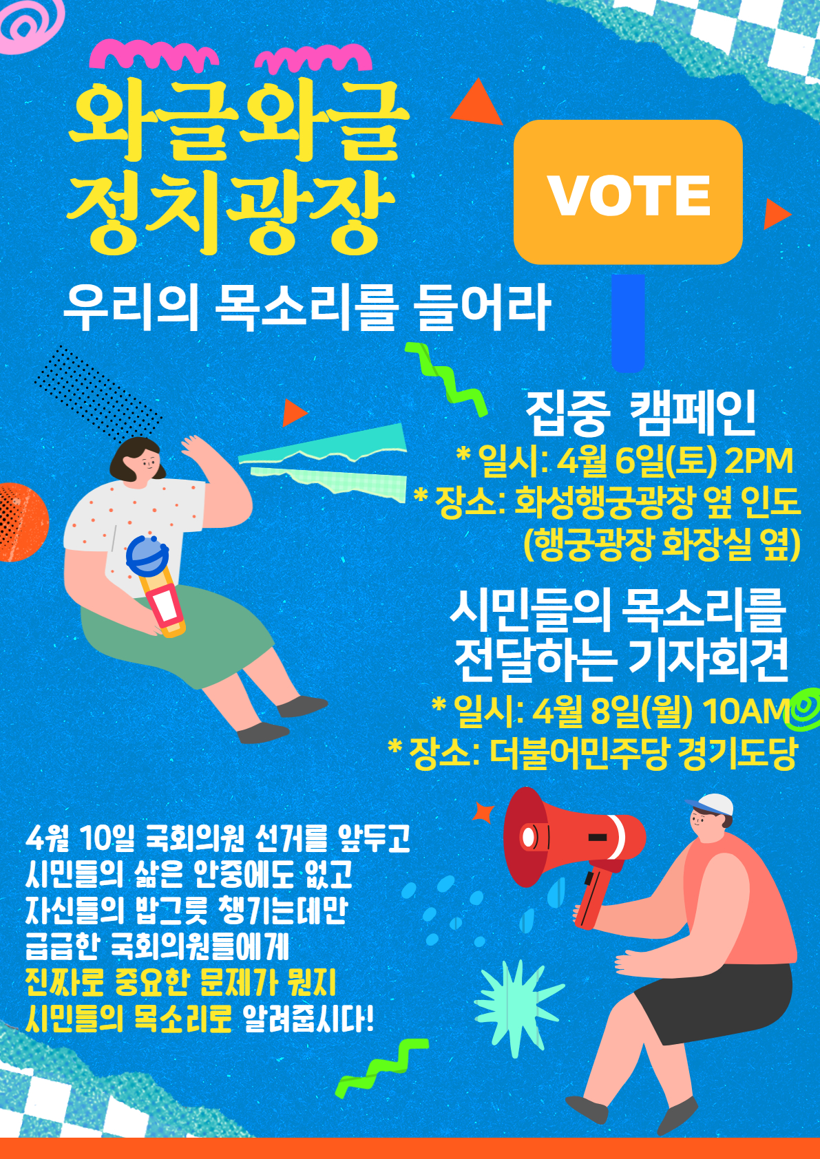 3/31(일) 2pm 화성행궁 화령전 입구(행궁동 새마을 문고 건너편), 4/6(토) 2pm 수원화성행궁화장실 옆 보도에서 네 차례 ‘우리의 목소리를 들어라’ 캠페인을 진행합니다. 8일(월) 10시에는 캠페인에서 나온 이야기들을 거대 양당에 전달하는 기자회견을 열 예정입니다. 우리 삶에 진짜 중요한 이슈를 동료 시민들과 국회의원 후보들에게 큰 소리로 외치고, 우리의 목소리에 귀 기울이라고 요구합시다.
