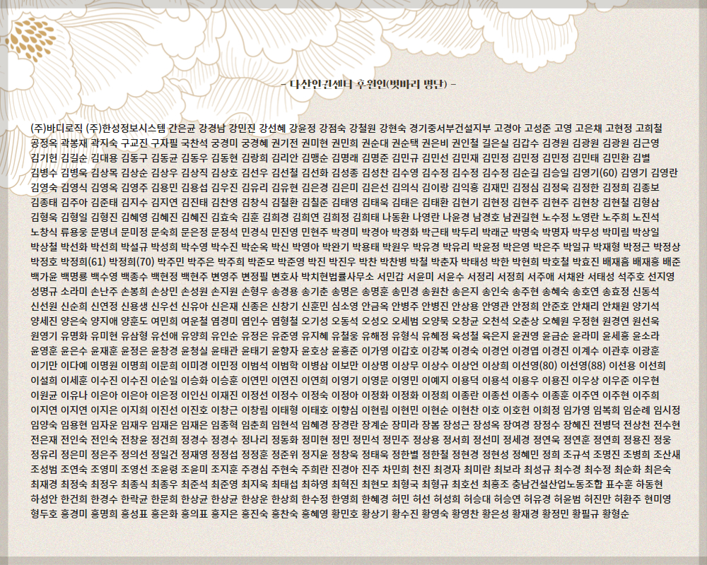 * 후원명단 정리 중 실수로 누락된 벗바리가 있을 수 있습니다. 전화(031-213-2105)나 이메일(humandasan@gmail.com)으로 연락주시면 수정하도록 하겠습니다. 널리 양해 바랍니다.
