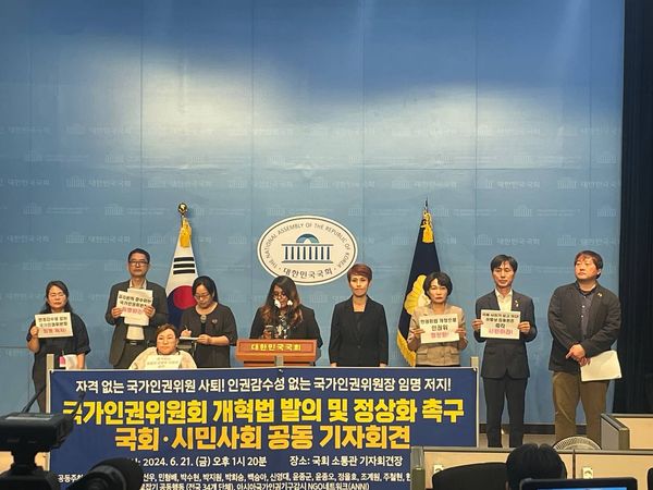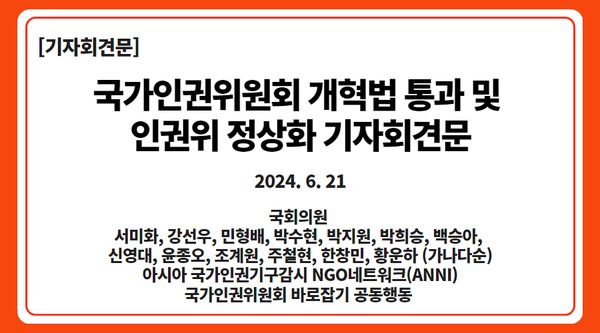 이를 위해 더불어 민주당 서미화 국회의원 등 15인의 국회의원들과 전국 34개 인권 · 시민사회단체가 참여하는 “국가인권위원회 바로잡기 공동행동(약칭인권위 바로잡기 공동행동)” 및 아시아 국가인권기구감시 NGO 네트워크(ANNI)가 오늘 (21일) 국회 정론관에서 최근 국가인권위원회 사태와 관련하여 자격없는 국가인권위원 사퇴와 차기 국가인권위원장 임명에 대한 입장 및 국가인권위원회 개혁법 발의에 관한 공동기자회견을 개최하였습니다.