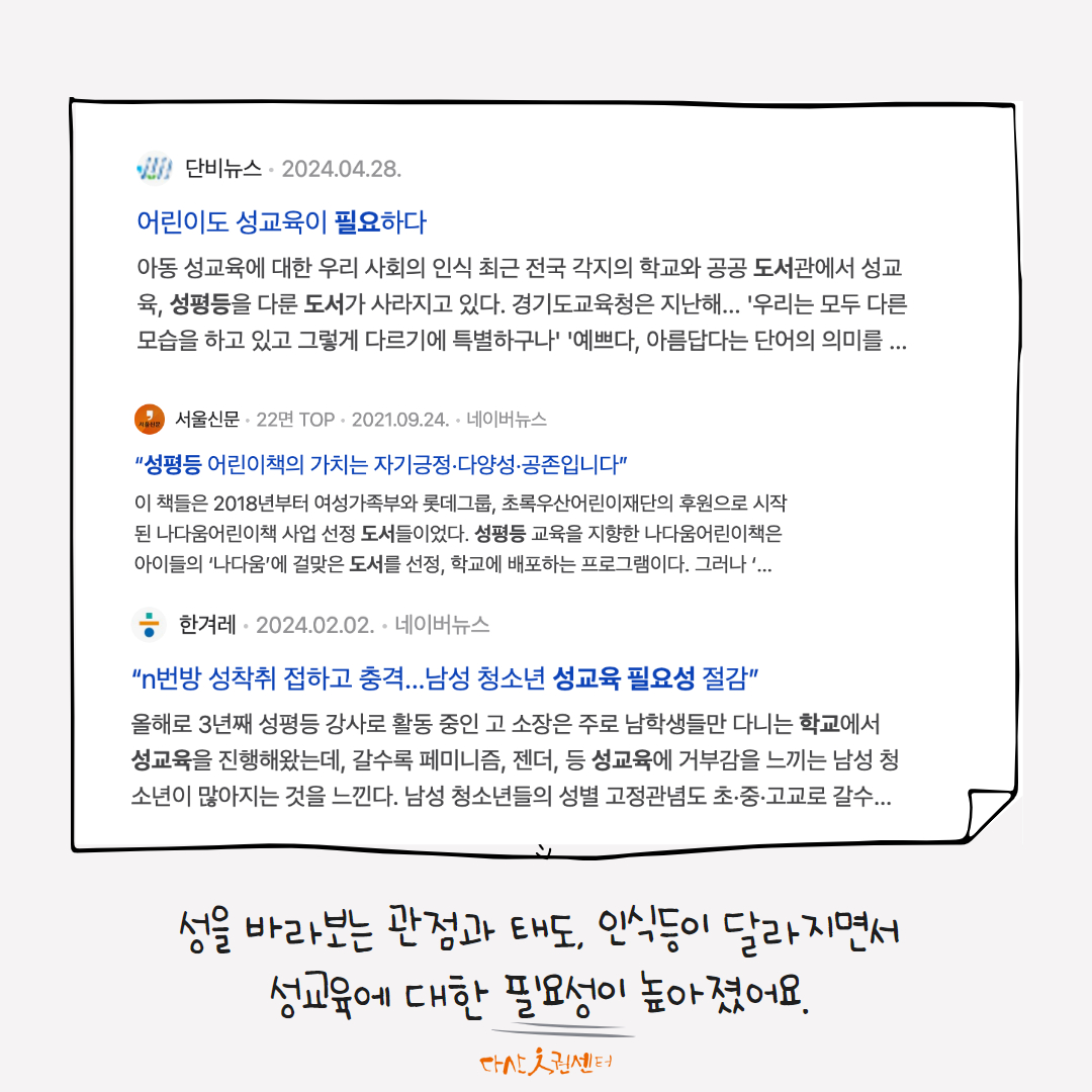 하지만 지금은 성을 바라보는 관점과 태도, 인식 등이 달라지면서 성교육에 대한 필요성이 높아졌습니다.