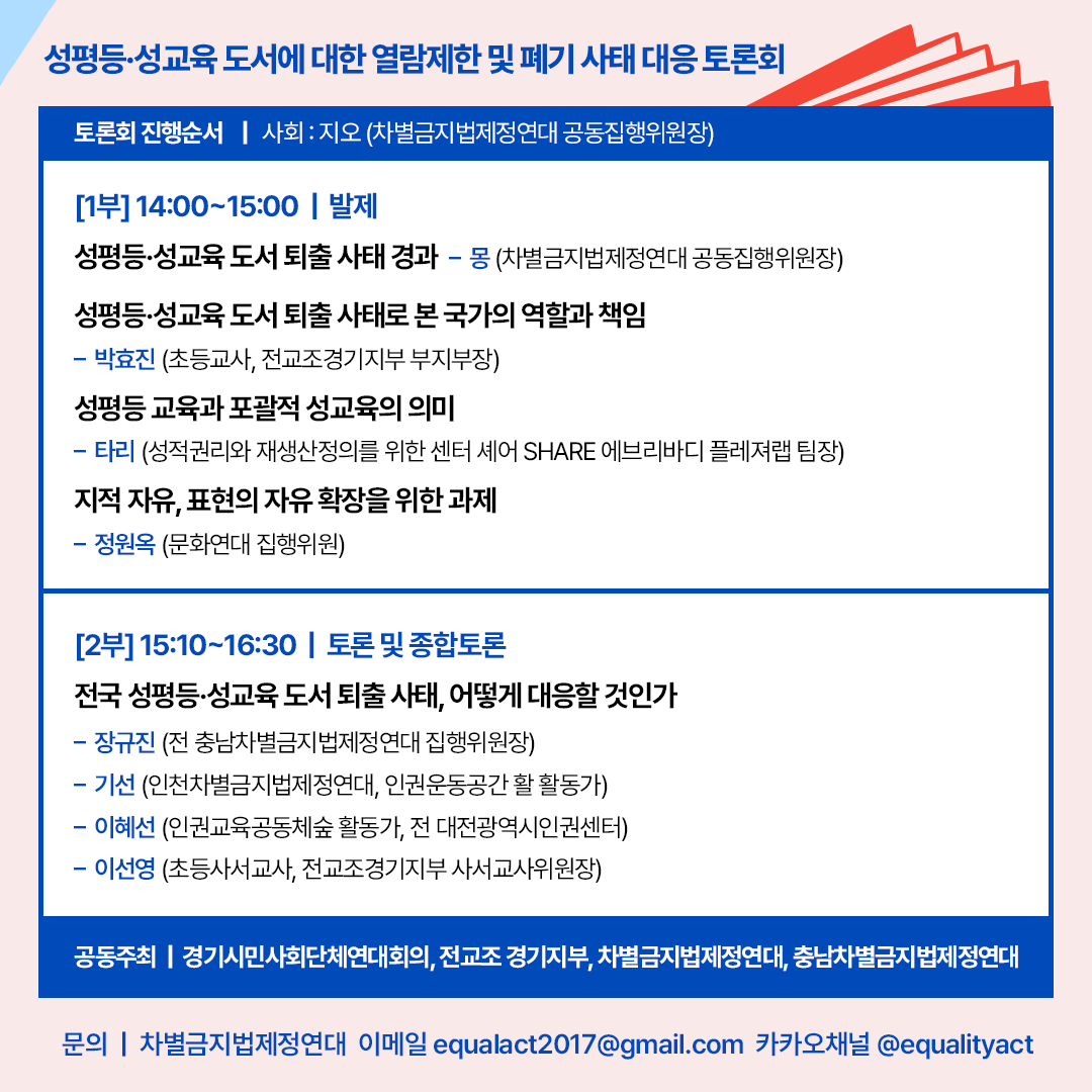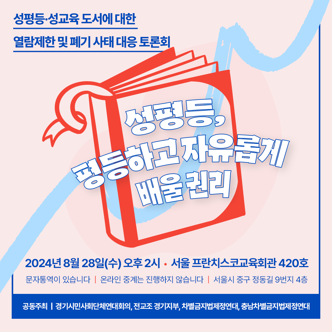 이에 경기시민사회단체연대회의, 전교조 경기지부, 차별금지법제정연대, 충남차별금지법제정연대는 8월 28일(수) 오후 2시 성평등·성교육 도서에 대한 열람제한 및 폐기 사태 대응 토론회 <성평등, 평등하고 자유롭게 배울 권리>를 개최합니다. 이번 토론회에서는 성평등·성교육 도서 퇴출 사태가 한국사회에서 어떤 영향을 미치고 있는지를 구체적으로 짚어보고, 열람제한 및 폐기 사태가 반복되지 않기 위해 필요한 대응 방향을 논의합니다.