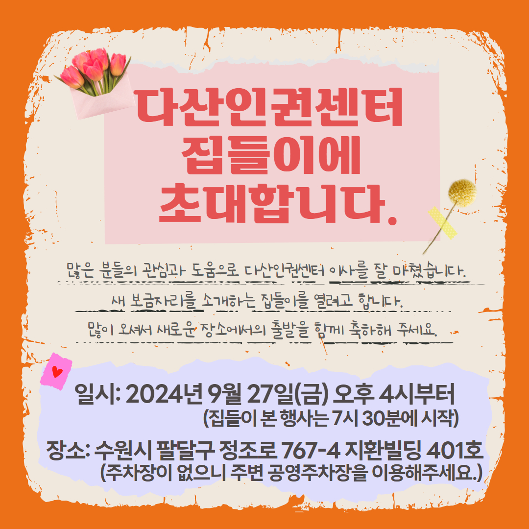 많은 분들의 관심과 후원으로 다산인권센터 이사를 잘 마쳤습니다. 드디어 새로운 공간에 손님들을 초대할 수 있게 되어 집들이를 열려고 합니다.