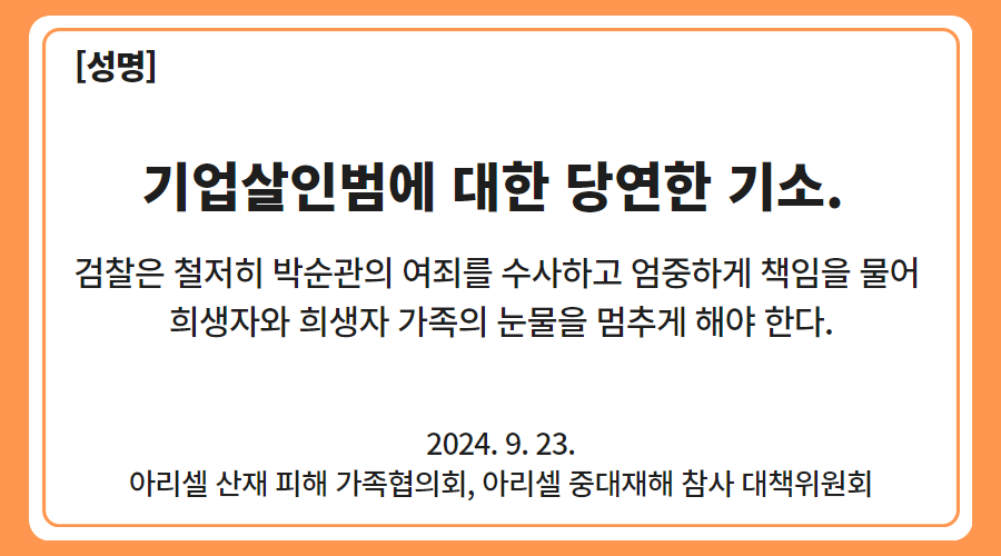 [성명] 기업살인범에 대한 당연한 기소. 검찰은 철저히 박순관의 여죄를 수사하고 엄중하게 책임을 물어 희생자와 희생자 가족의 눈물을 멈추게 해야 한다.