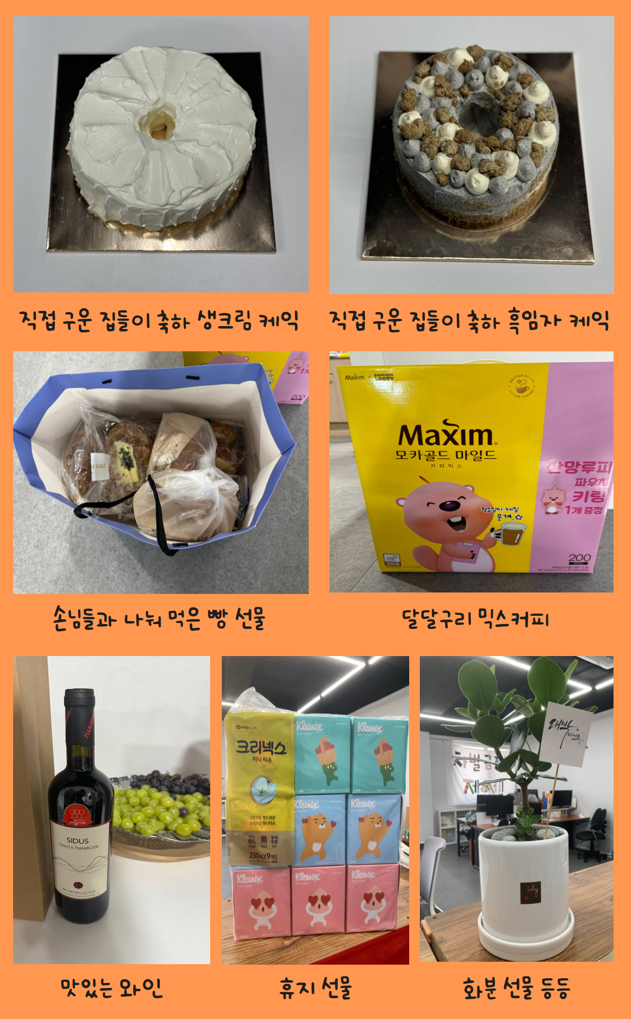 낮부터 이전식 프로그램이 시작된 저녁 시간까지 집들이 축하하기 위한 손님들이 꾸준히 이어졌는데요, 다산의 벗바리들부터 수원지역 활동가, 타 지역의 활동가까지 다양한 분들이 새 사무실을 찾아주셨습니다. 집들이 선물의 클래식 휴지부터 화분, 먹을거리, 와인, 믹스커피까지 선물도 듬뿍 받았네요.