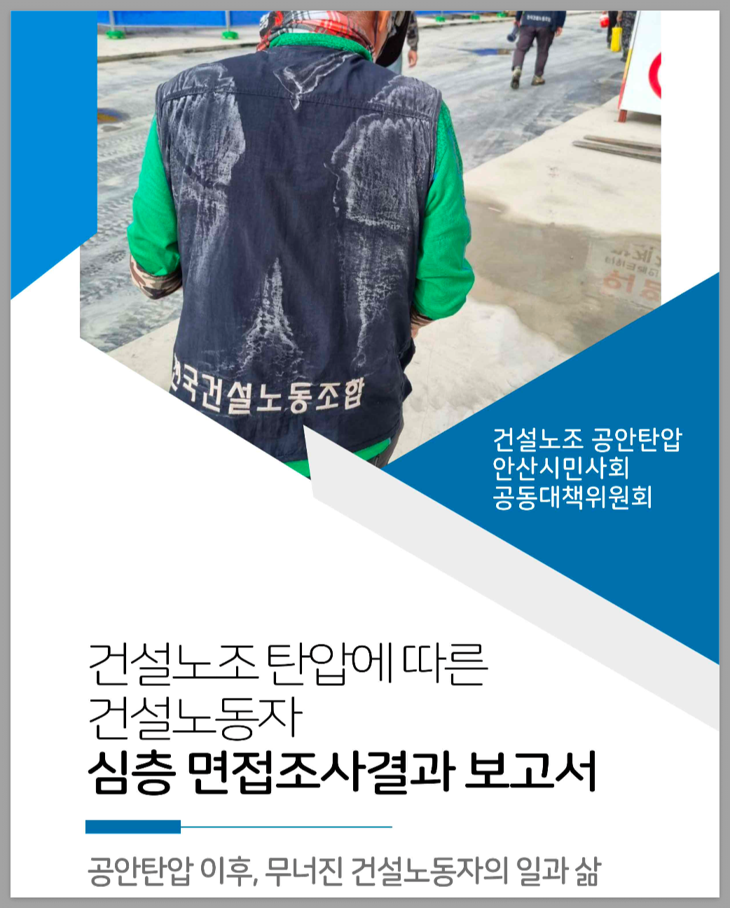 "탄압 이후에 임금도 줄고, 시간도 그렇고 물량도 그렇고, 집에 와서 얘기하면 그 피로감 때문에 한번 나가서 산책하기도 싫어요. 산책하기 싫고 귀찮아요. 힘들어서." 심층면접을 통해 목도한 건설현장과 건설노동자의 삶은 탄압 전과 너무나도 달라져 있었습니다. 부실공사를 신고하면 해고를 당하고, 노동시간과 노동강도는 증가 지만 휴식은 보장 되지 않고, 건설노조라는 이유 하나로 채용을 거부 당하는 상황에 놓였습니다.