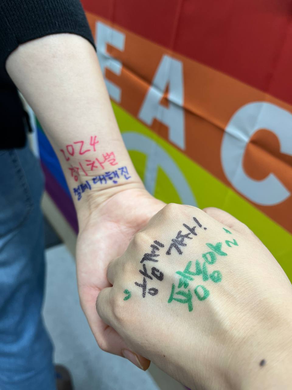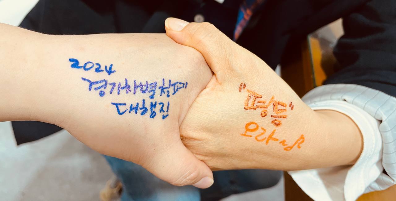 2. 한 사람의 손에 ‘2024 경기차별철폐대행진’을 다른 한 사람의 손에 각자 생각하는 ‘차별철폐, 평등의 다양한 문장’을 작성해 주세요.