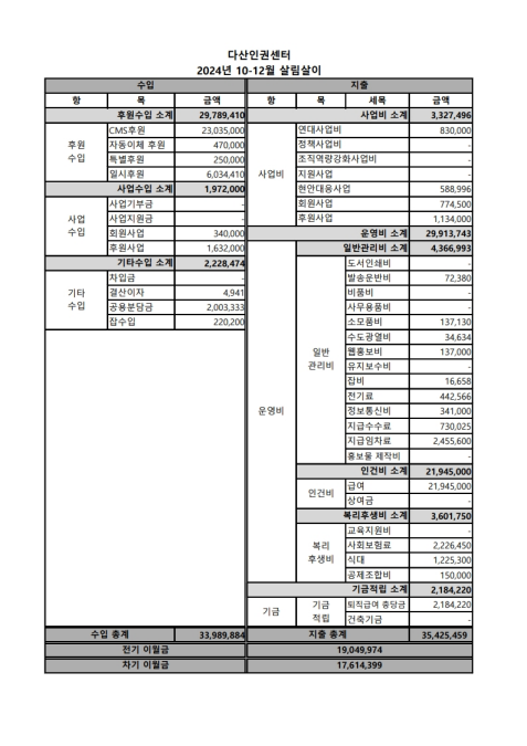 2024년 10월부터 12월까지 다산인권센터 살림살이 내역과 정기적으로 다산을 후원해주신 벗바리 명단입니다. 언제 어디서나 응원과 지지 보내주시는 분들이 있어, 더 힘내어 나아갈 수 있었습니다. 항상 감사합니다.