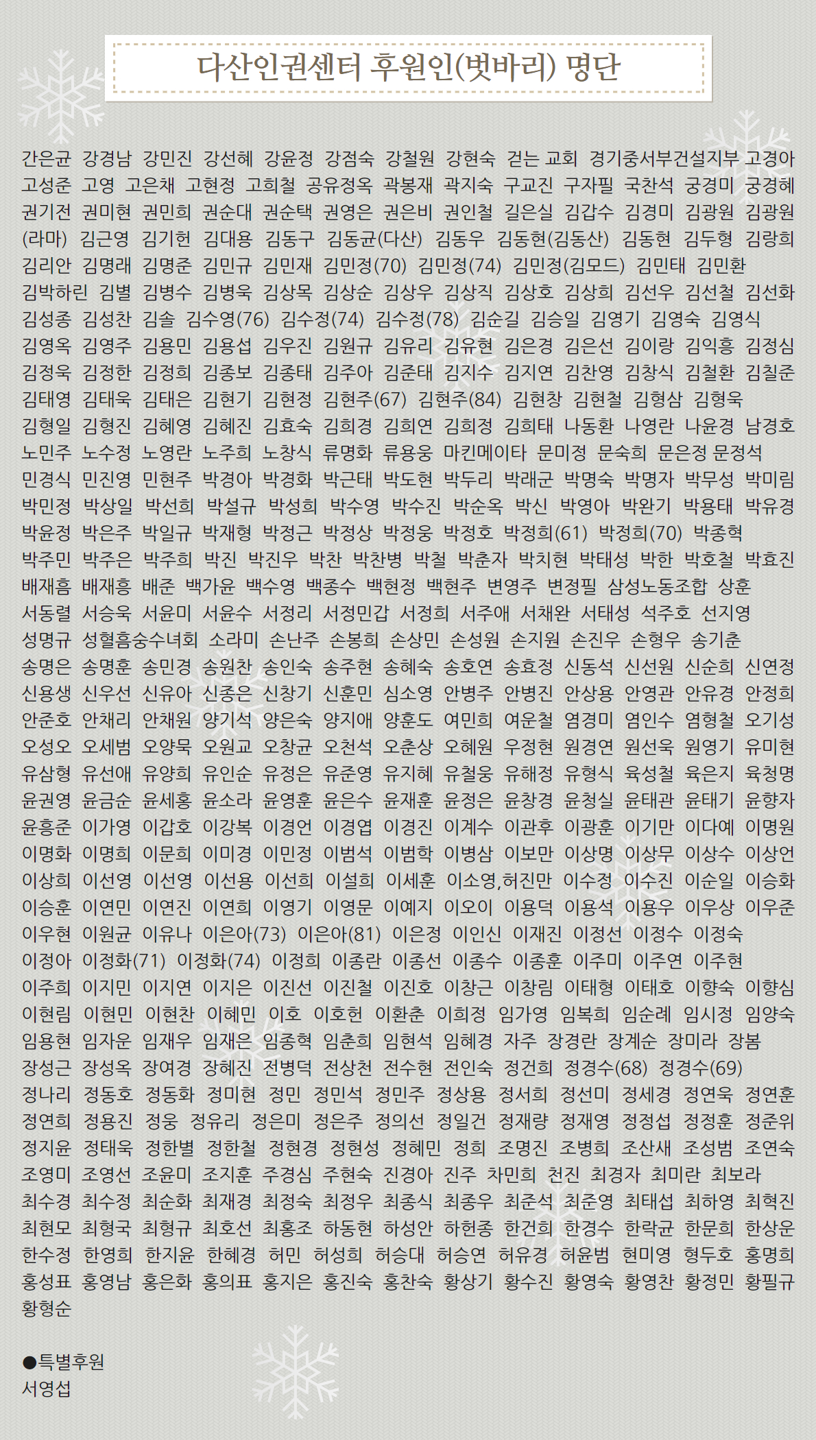 * 후원명단 정리 중 실수로 누락된 벗바리가 있을 수 있습니다. 전화(031-213-2105)나 이메일(humandasan@gmail.com)으로 연락주시면 수정하도록 하겠습니다. 널리 양해 바랍니다.