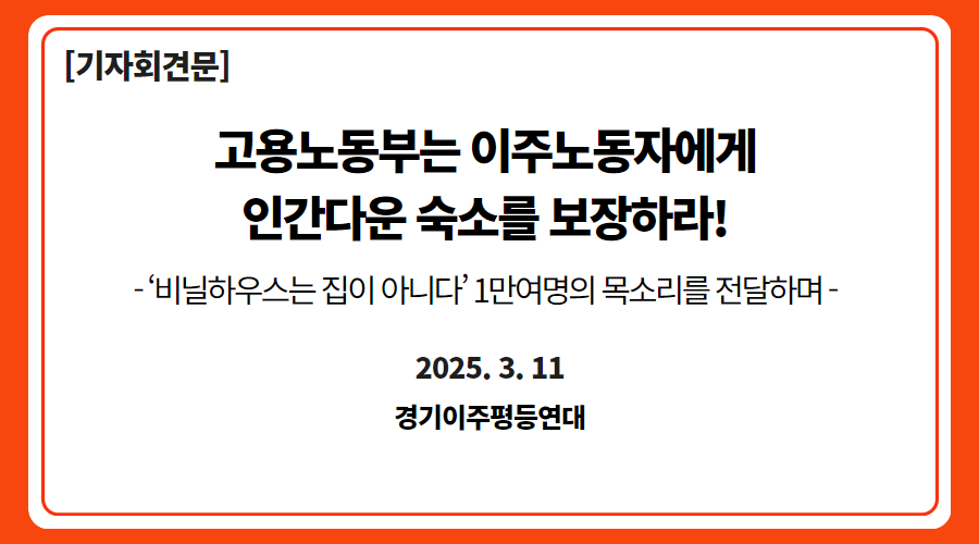 오늘 우리는 평등사회를 외치는 민주 광장에서 이주노동자의 인간다운 숙소를 요구하는 시민들의 서명을 고용노동부에 전달한다. 그리고 이 문제가 해결될 때까지 고용노동부를 규탄하며 싸워갈 것이다. 전근대적이고 비인간적인 시설을 이주노동자 숙소로 방치하며, 고용허가제가 성공한 제도라고 대외적으로 홍보하는 고용노동부는 그야말로 이주노동자를 비롯한 노동자들의 삶을 계엄상황으로 내모는 집단에 불과하다.