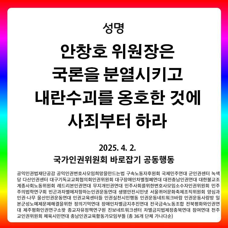 3. 묻는다. 누가 국론을 분열시켰는가. 내란수괴 옹호 의견표명을 하며 국민의 50%가 헌법재판소를 불신한다고 하고, 유엔 인권최고대표사무소에 헌법재판소를 비난하는 서한을 보낸 안창호가 아닌가. 또 묻는다. 누가 가장 탄핵심판 선고결과를 받아들이지 않겠는가. 비상계엄을 통치행위라 정당화하고 야당의 탄핵남용이 국헌문란이라고 한 안창호와 김용원, 그리고 이들을 따른 4인 인권위원이 아닌가