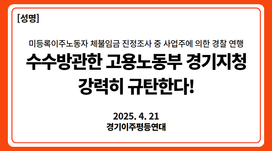 도저히 묵과할 수 없다. 이번 사태를 그냥 넘어간다면 이주노동자들은 자신의 권리를 제대로 제기조차 할 수 없을 것이다. 기본 중의 기본도 지키지 못하는 고용노동청은 존재할 이유가 없다. 고용노동부 경기지청을 강력히 규탄한다!. 고용노동부 경기지청은 사과하고 재발 방지를 약속하라! 연행당한 이주노동자가 추방당하지 않도록 모든 조치를 강구하라!