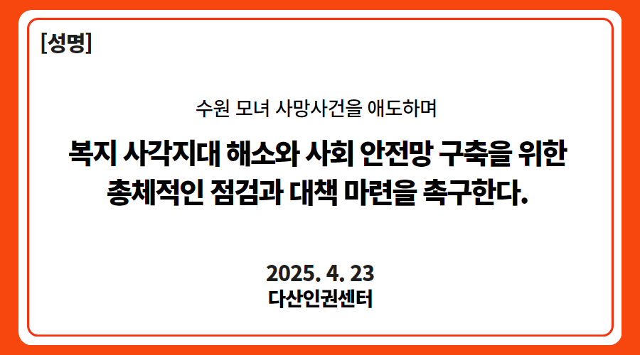 우리는 지난 수원 세 모녀 사건의 교훈이 제대로 작동하지 못했음을 깊이 인식하며, 정부와 수원시에 다시 한번 복지 사각지대 해소와 사회 안전망 구축을 위한 총체적인 점검과 대책 마련을 촉구한다.