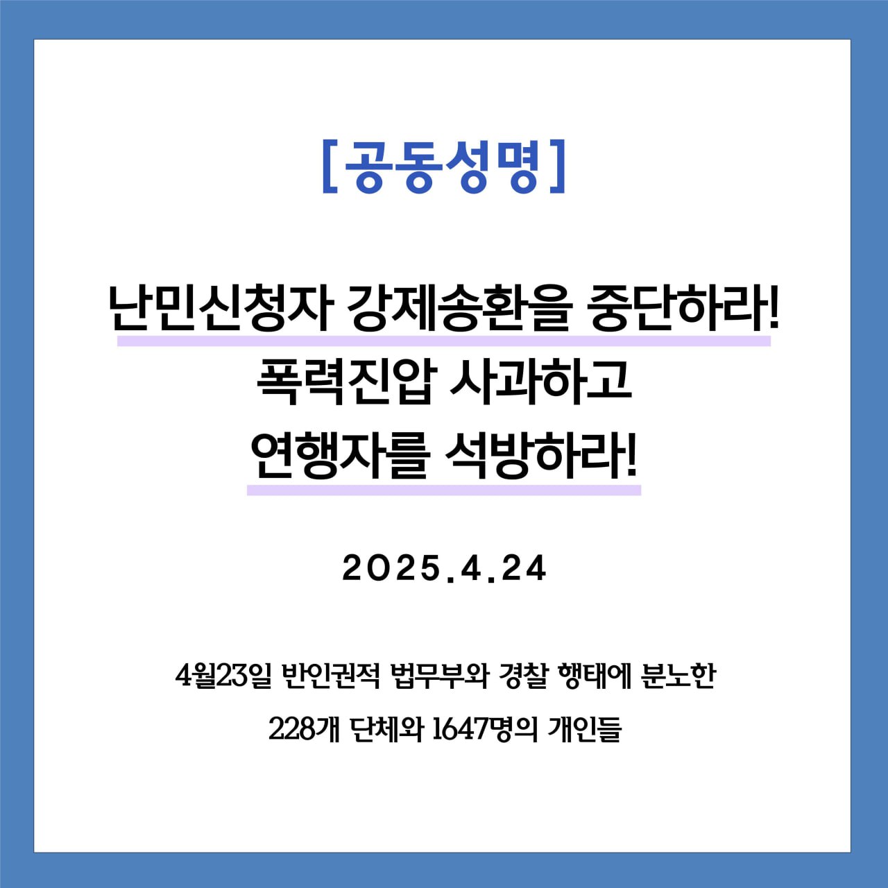 법무부는 반인권적 강제송환에 대해 사과하고, 지금 당장 강제송환 중단하라!