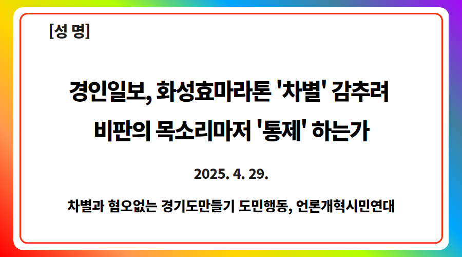 더 문제는 이러한 차별적인 기준을 비판하는 목소리를 차단하고 있는 화성 효 마라톤 주최 측 중 한 곳인, 경인일보다. 경인일보는 화성 효 마라톤 참가 기준에 대해 비판하는 내용의 기고를 검열하여 게재를 거부했다. 이 기고는 ‘문득인권’이라는 제목으로 2022년부터 고정적으로 게재하는 칼럼이었다. 4월 28일 게재될 칼럼 내용이 해당 언론사(경인일보)와 마라톤 대회(화성 효 마라톤)를 언급하고 비판하는 내용이었다는 것이 거부의 이유였다. 마라톤 참가 기준의 차별성을 인지하고 사회적 흐름을 반영한 변화가 필요하다는 것이 기고의 주요 방향이었다. 인권 관련 주제를 고정적으로 기고하는 칼럼의 방향에서 벗어나지 않는 내용이었다. 단지, 경인일보와 주최하는 화성 효 마라톤의 차별적인 부분을 제기했다는 이유로 자의적으로 검열하고 통제한 것이다. 검열과 통제에 가장 민감하게 맞서야 할 언론사가 오히려 자유로운 비판의 목소리를 가로막고 있는 상황이다.